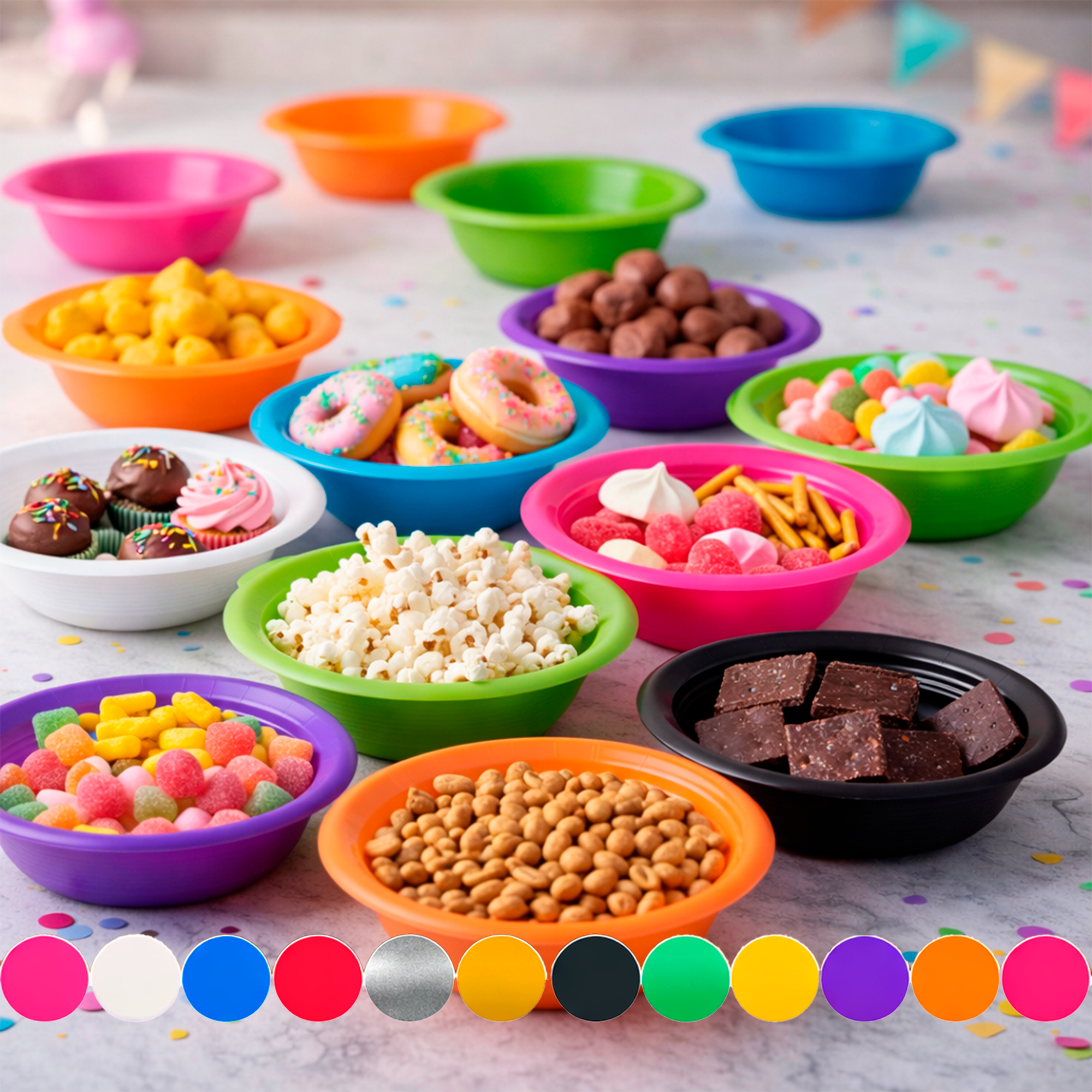 Pratos cumbuca descartáveis de 15cm ideais para servir doces, salgados, sobremesas, caldos e porções em festas de aniversário, eventos e comemorações em geral. Práticos, resistentes e higiênicos, facilitam o serviço e a organização da mesa.