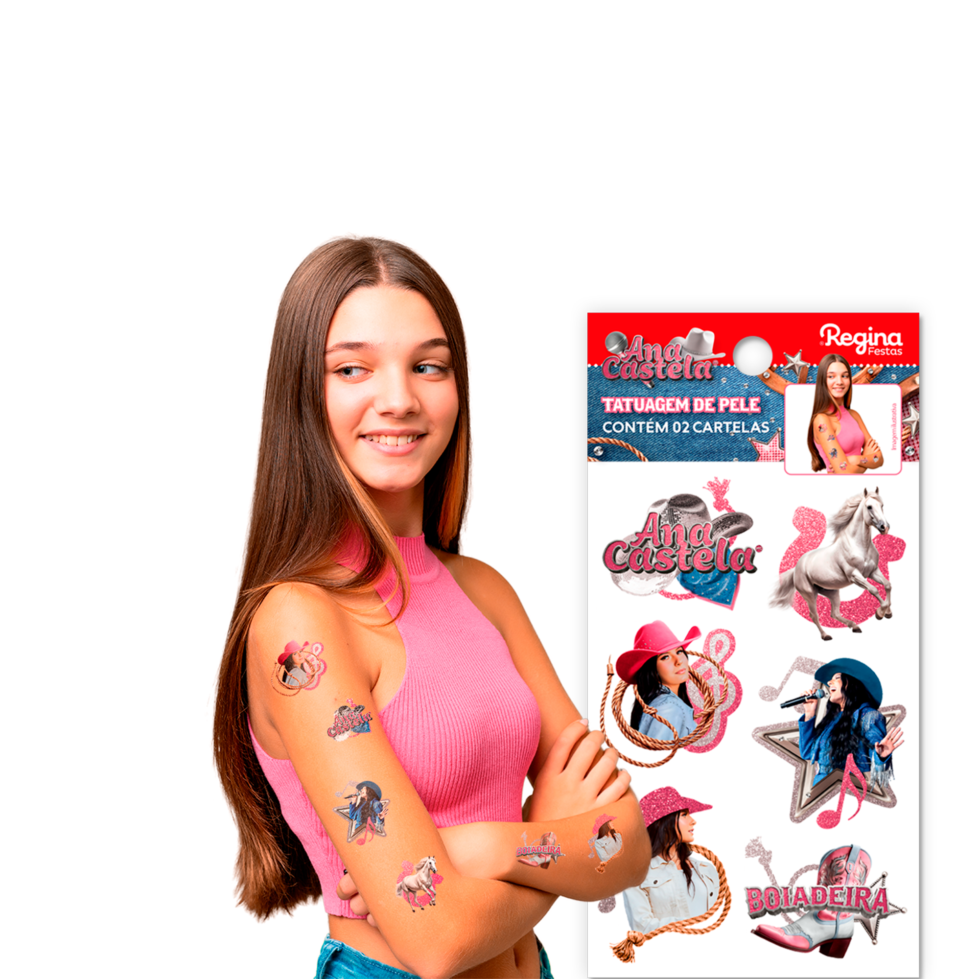 Transforme sua festa em uma celebração cheia de cor e personalidade com as tatuagens coloridas Ana Castela. Deixe seus convidados entrarem no clima boiadeiro e aproveite cada momento com muita alegria e estilo!