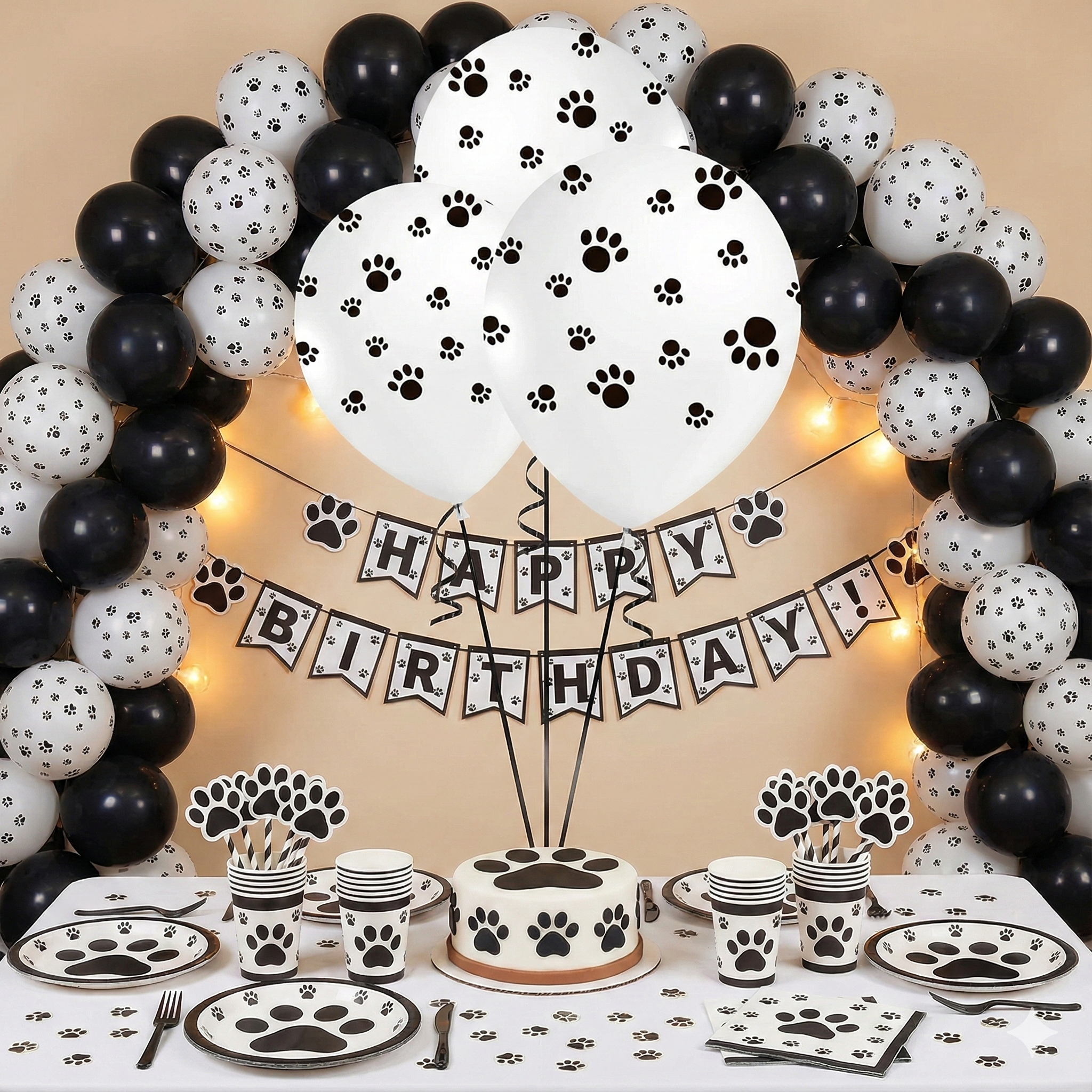 Monte arcos desconstruídos, painéis fotográficos, decore a mesa principal ou espalhe pelo ambiente para criar uma decoração completa e temática com patinhas.