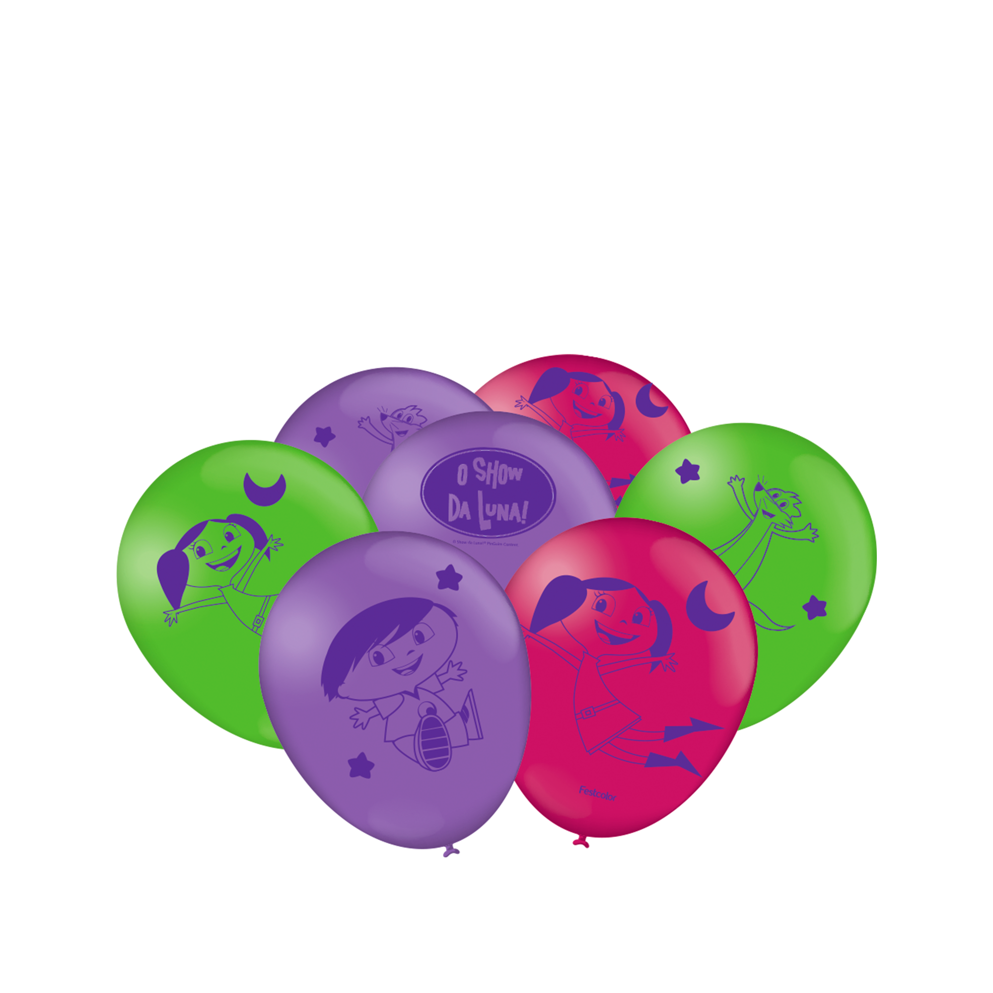 Com essas bexigas em tons de verde, vinho e lilás, estampadas com os personagens do Show da Luna, sua festa ganha um toque lúdico, inteligente e cheio de personalidade — ideal para pequenos exploradores e fãs da série!