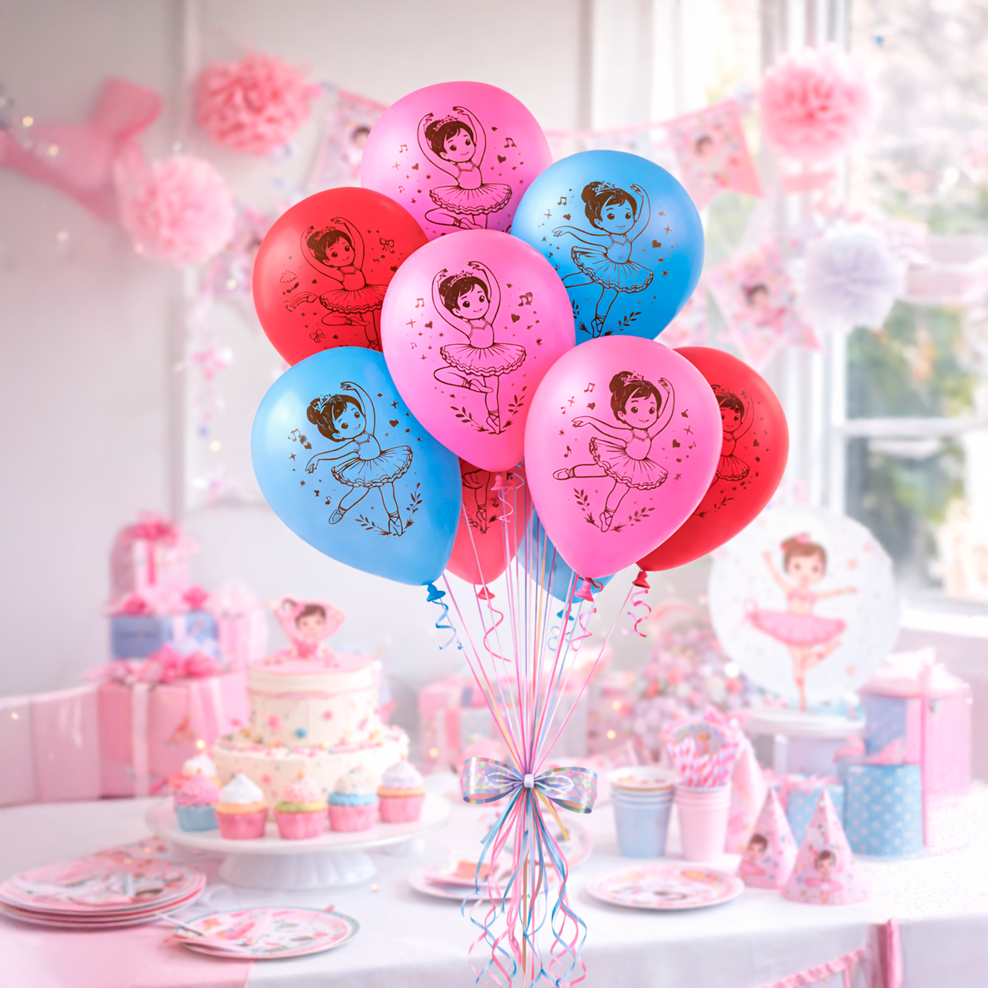 Quantidade: 25 unidadesTamanho: 11 polegadas (aproximadamente 28 cm após inflado)Material: Látex resistenteTema: BailarinaPode ser inflado com ar ou gás hélio