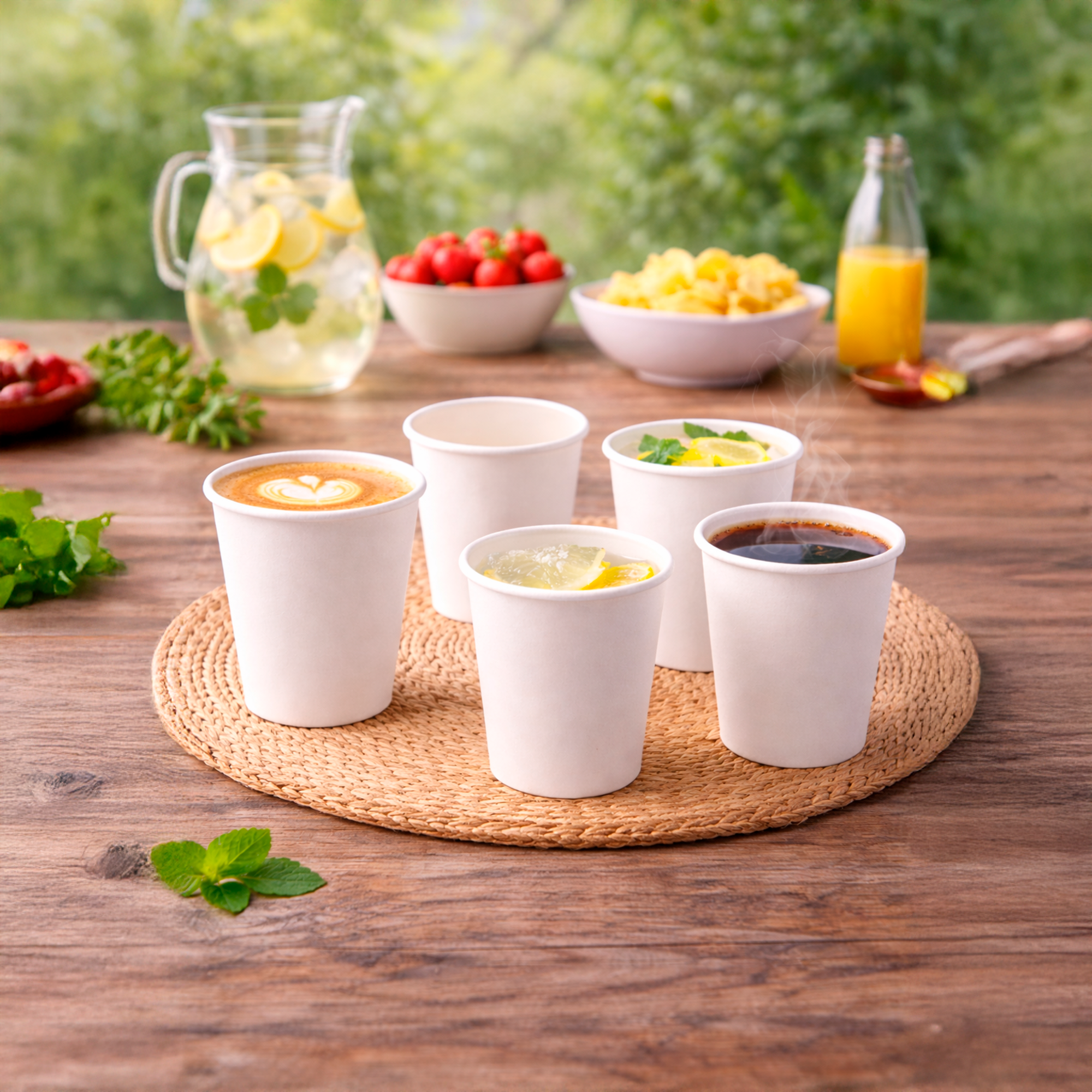 Copos de papel com capacidade de 240 ml, perfeitos para sucos, refrigerantes, água e outras bebidas em aniversários, chás, festas infantis e celebrações em geral. Produzidos em papel resistente com design festivo.