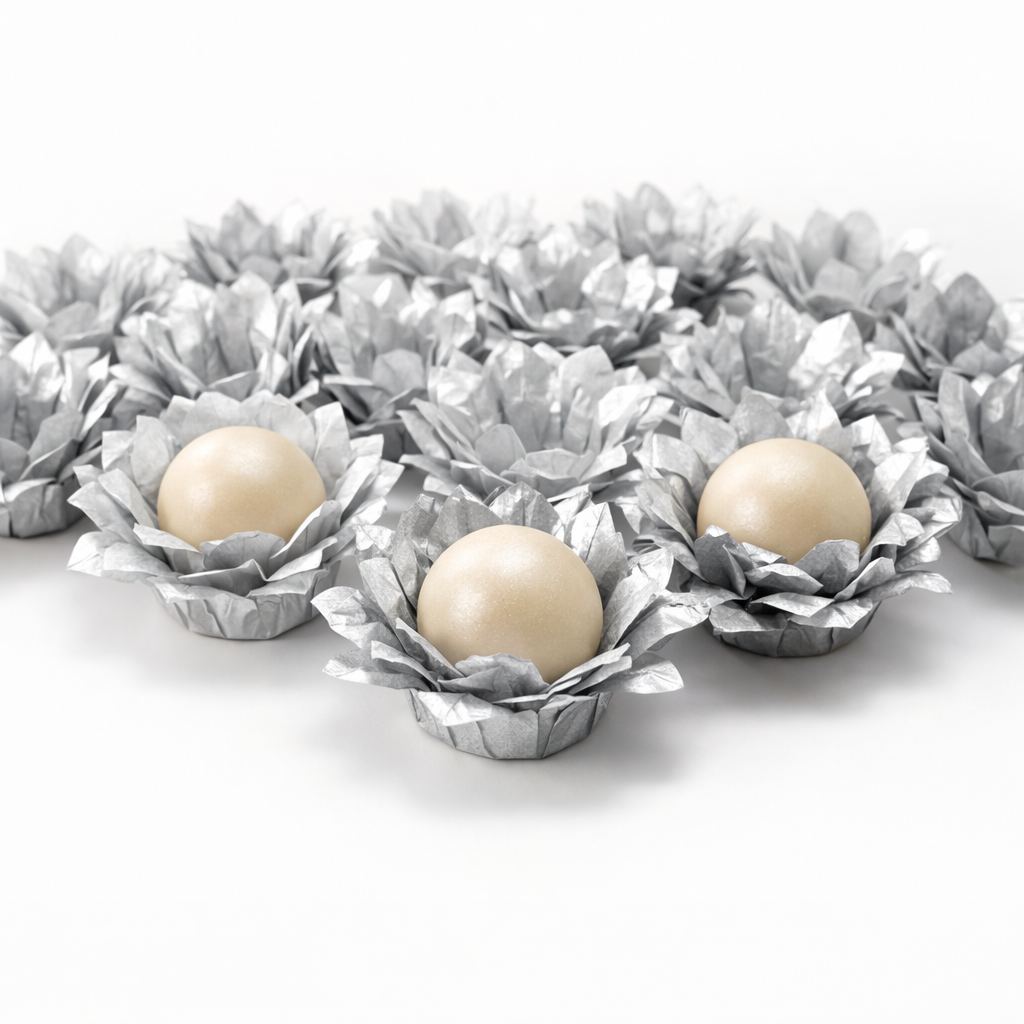 Forminhas decorativas na cor prata, ideais para acomodar e valorizar doces finos como brigadeiros gourmet, trufas, bombons e outros doces delicados. Perfeitas para dar um toque elegante e sofisticado à mesa de doces em festas e eventos.