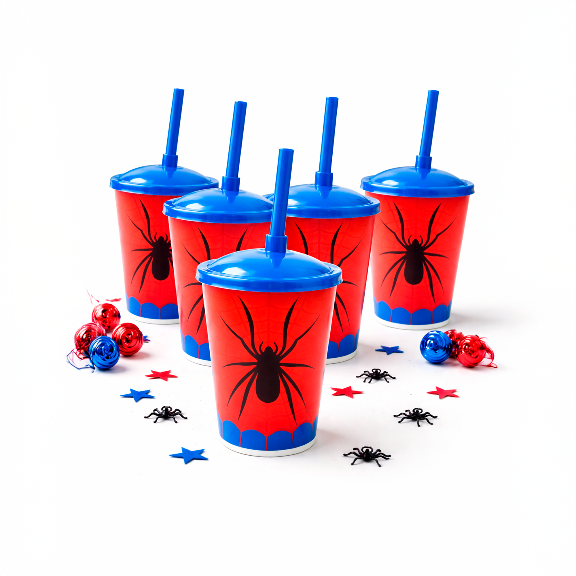 5 Copo Plástico 400ml com Tampa e Canudo Tema Aranha – Festa e Decoração