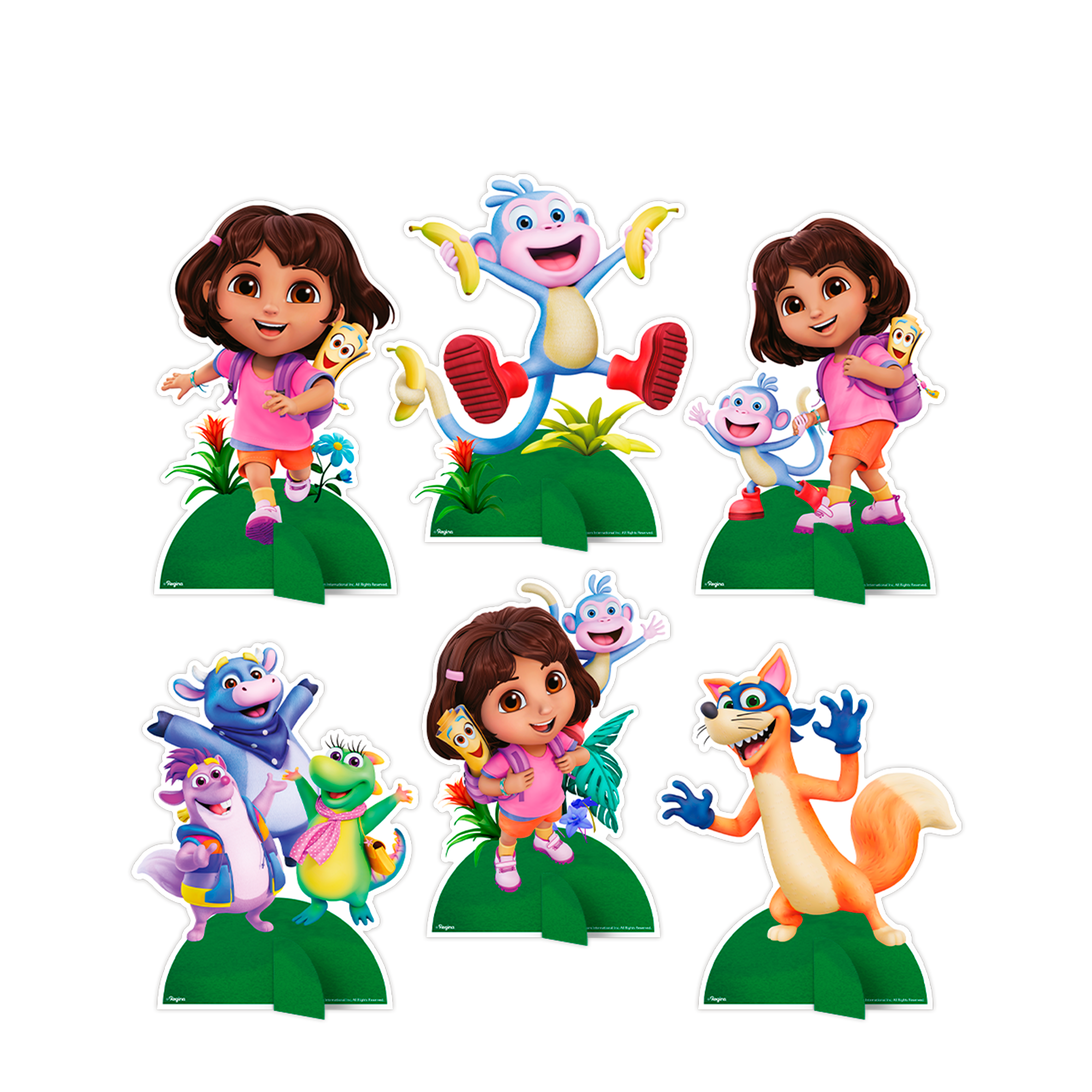 Deixe a decoração da sua festa ainda mais divertida e cheia de cor com este kit de 6 displays de mesa com o tema Dora Aventureira. Ideal para transformar a mesa principal ou complementar a ambientação do ambiente com muito charme.