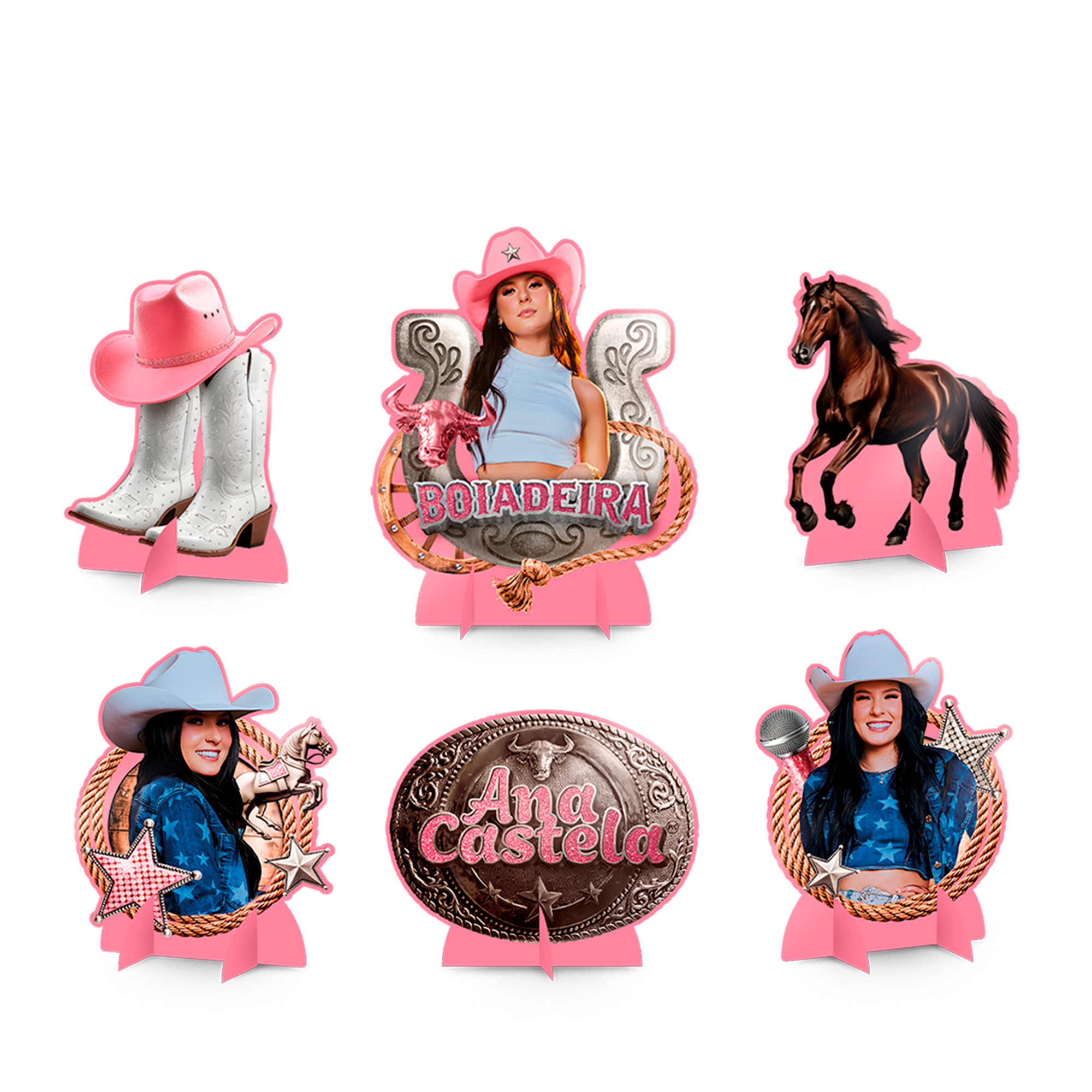 Adicione um toque sertanejo encantador à sua festa com os Displays de Decoração Ana Castela - Festa Boiadeira! Com 6 unidades, cada display possui 19 cm de altura e traz toda a energia e estilo da cantora Ana Castela para a sua comemoração.