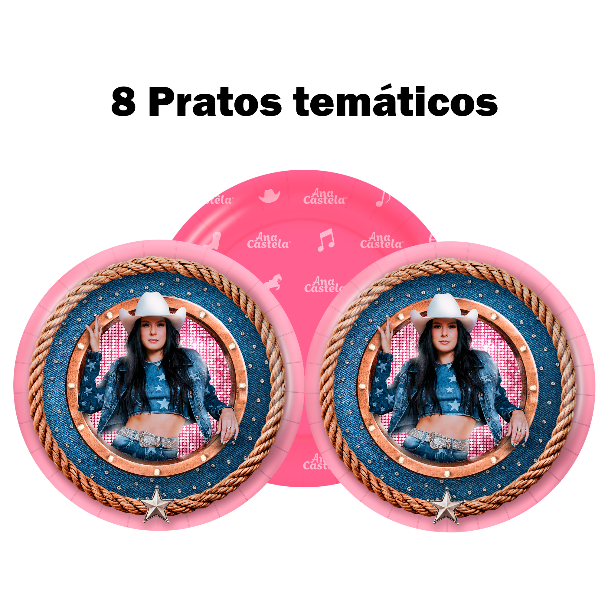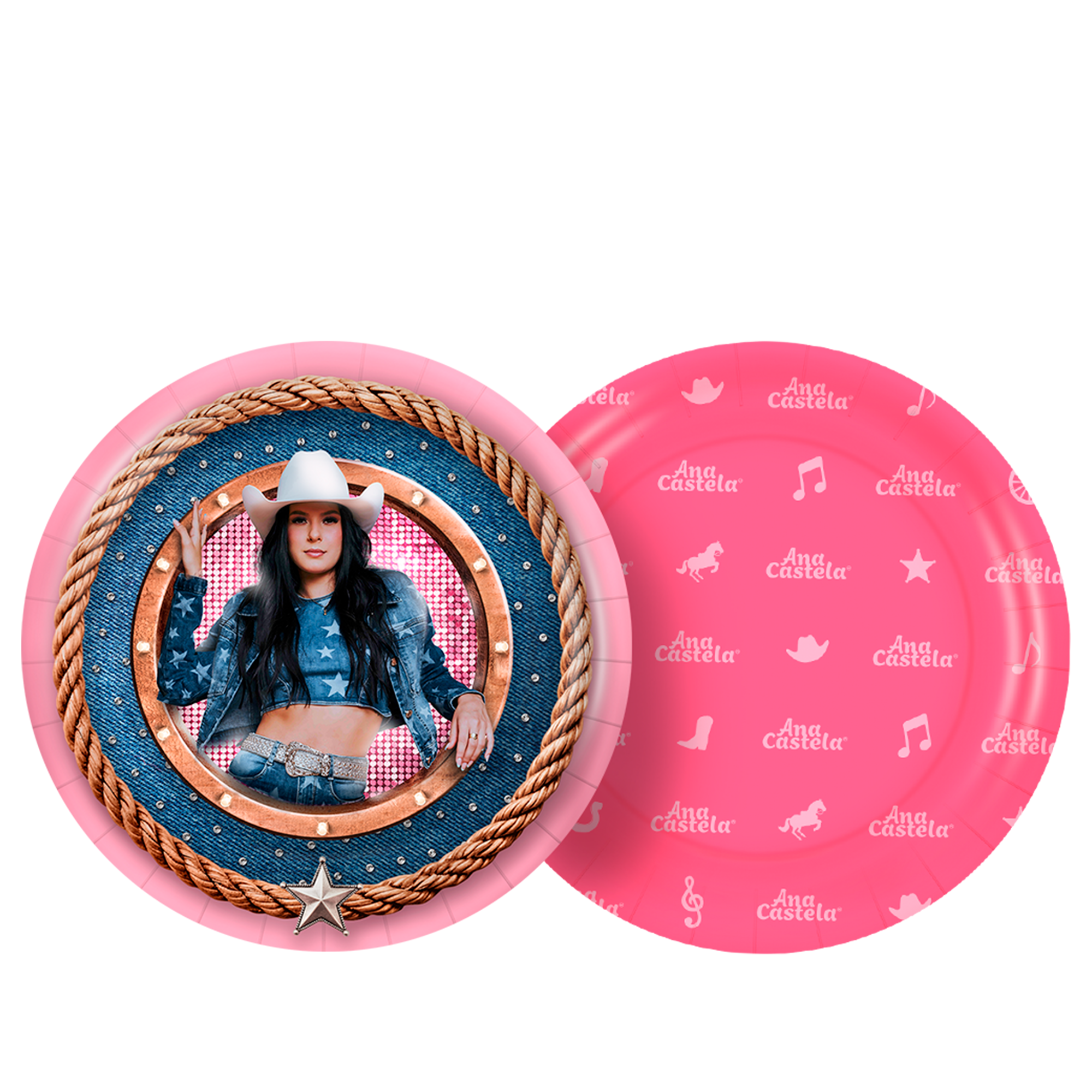 Feitos de material resistente e de qualidade, esses pratos são práticos e seguros, garantindo uma experiência tranquila durante o evento. Eles são uma excelente escolha para festas infantis, festas temáticas e até mesmo para os fãs que desejam celebrar momentos especiais com o charme sertanejo de Ana Castela. Surpreenda seus convidados com uma decoração inesquecível, repleta de cores e alegria, e transforme a sua festa em um verdadeiro show de sucesso!