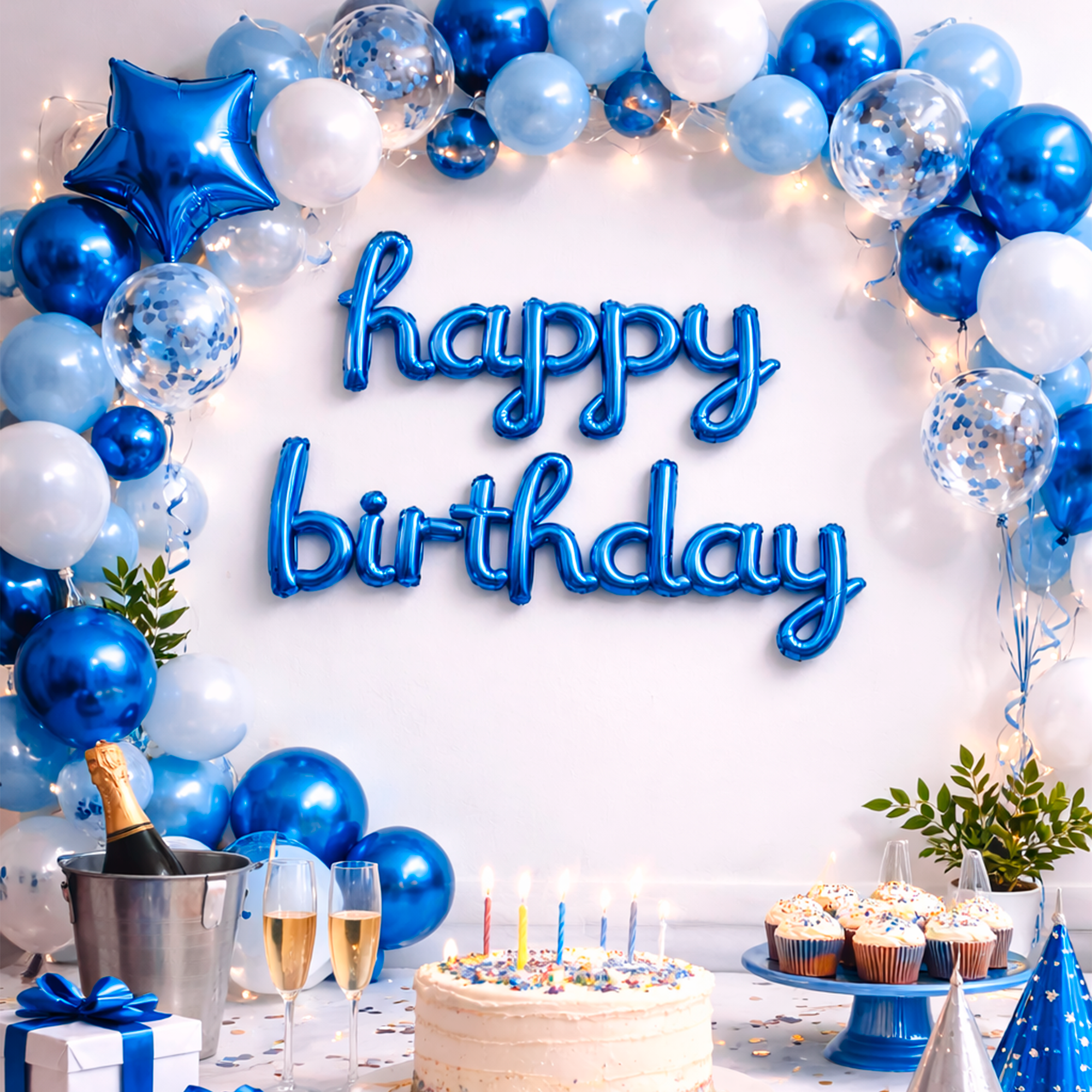 Balões metalizados com mensagem “Happy Birthday” na cor azul, ideais para decorar aniversários, festas e celebrações com estilo. Eles adicionam brilho e destaque ao ambiente, combinando com outros itens decorativos para uma composição festiva.