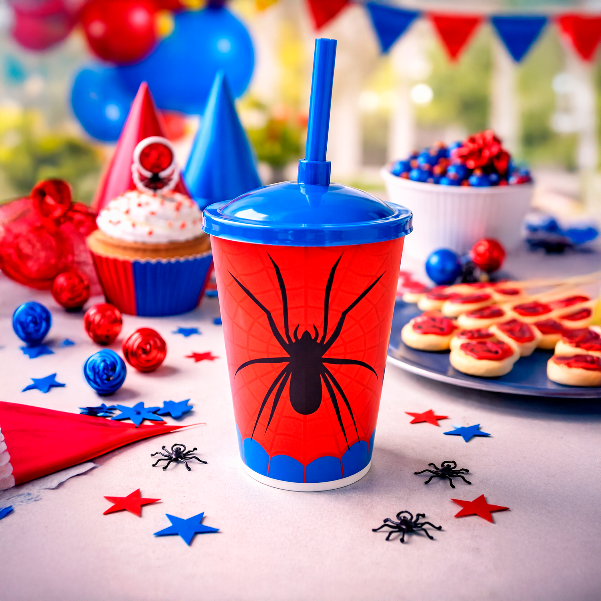 Copo plástico com tampa e canudo tema aranha, ideal para festas temáticas, aniversários infantis e eventos. Perfeito para servir sucos, refrigerantes e outras bebidas, deixando a decoração mais divertida e personalizada.