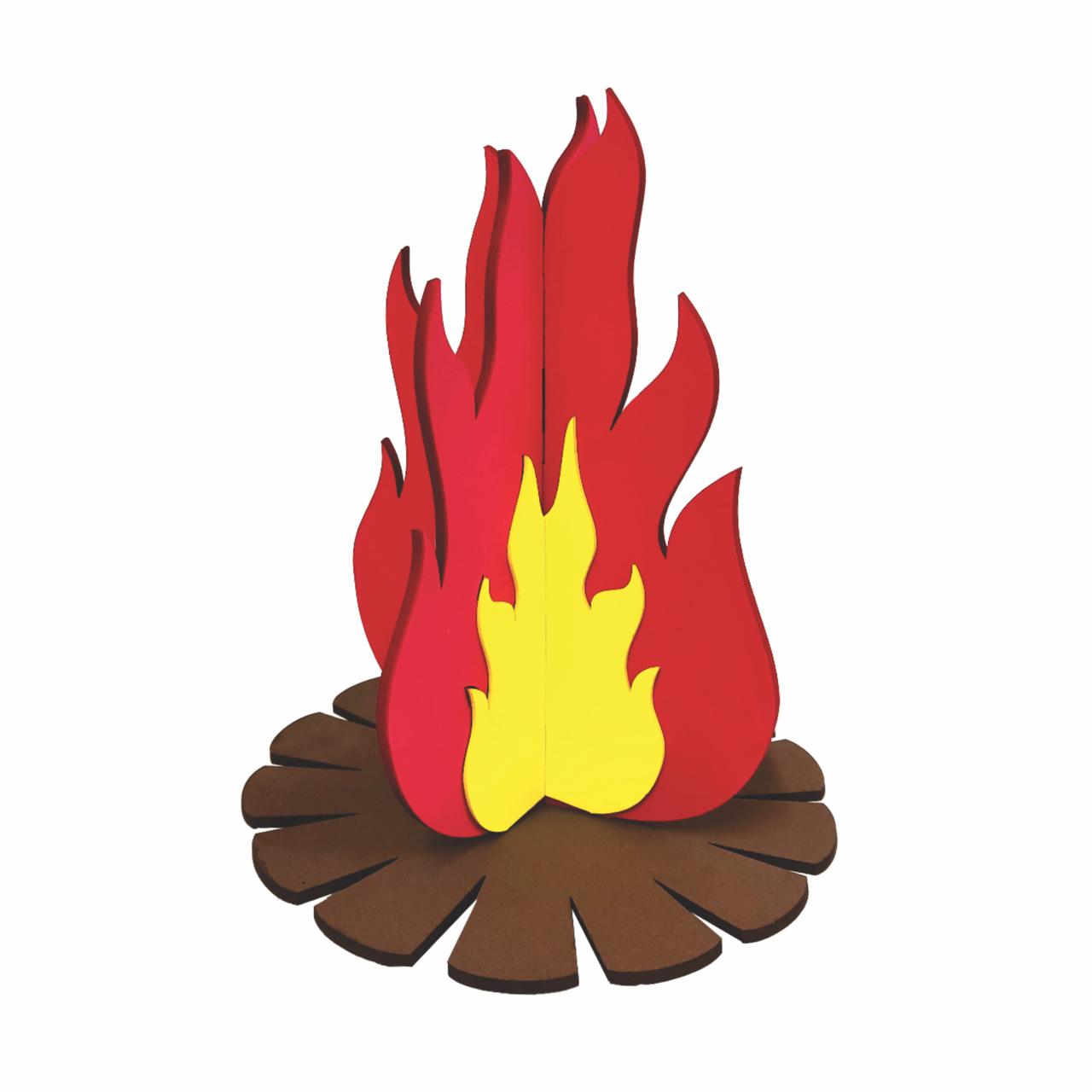 Design temático: Fogueira em estilo tradicional, com base simulando troncos de madeira e chamas em tons vibrantes de vermelho, laranja e amarelo, em camadas tridimensionais.