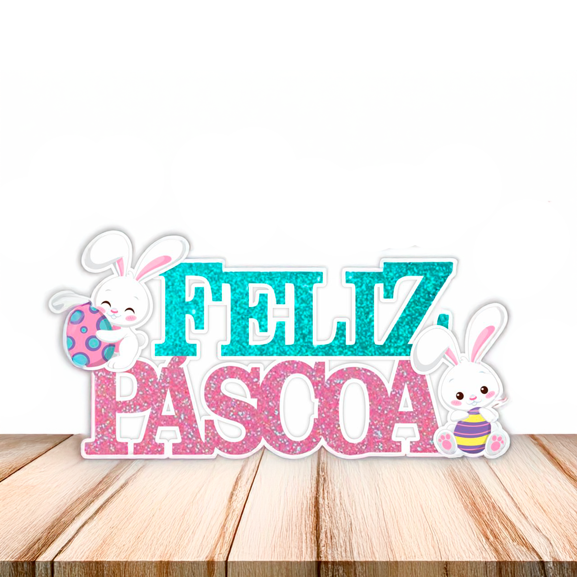 Dê um toque especial à sua festa de Páscoa com este lindo letreiro "Feliz Páscoa" com glitter. Com 56cm de largura, ele é ideal para decorar paredes, painéis, mesas e criar um ambiente festivo e encantador.