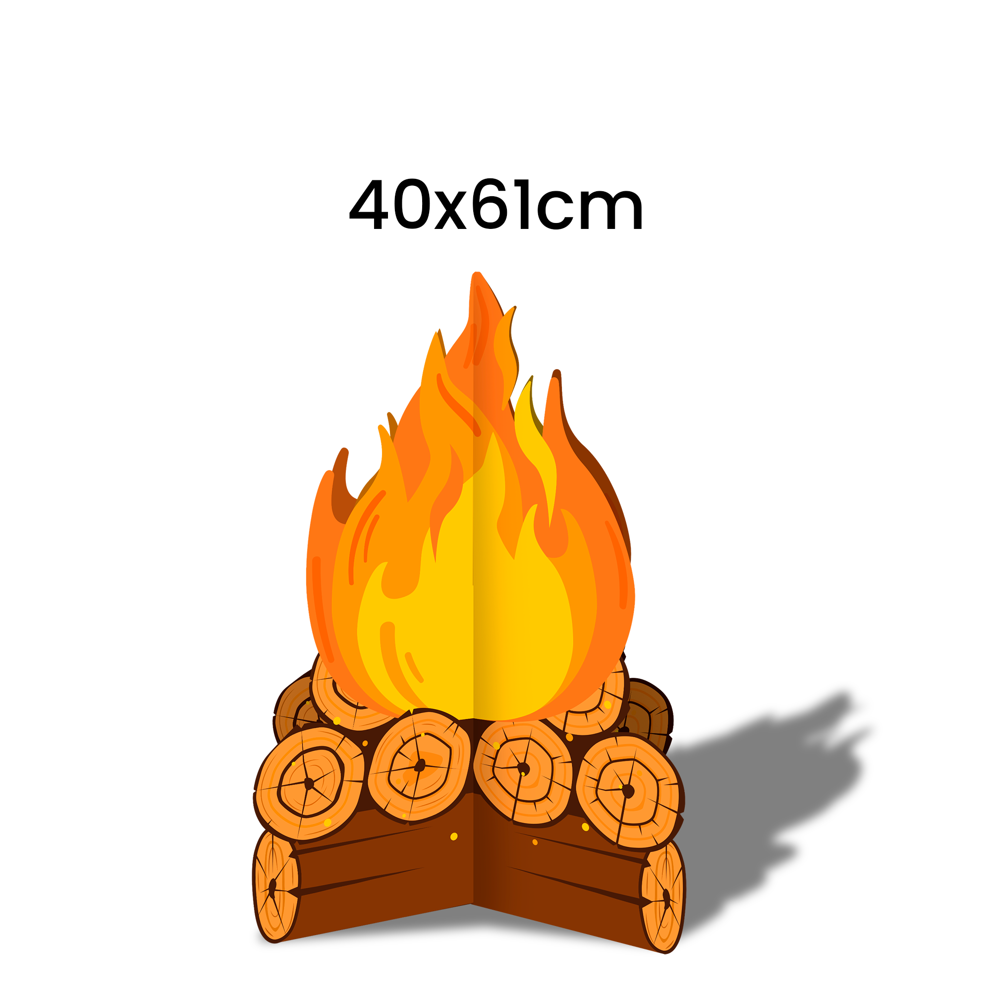Design temático: Fogueira estilizada com chamas coloridas e base de lenha, ideal para destacar áreas da festa e compor o cenário tradicional do arraiá.