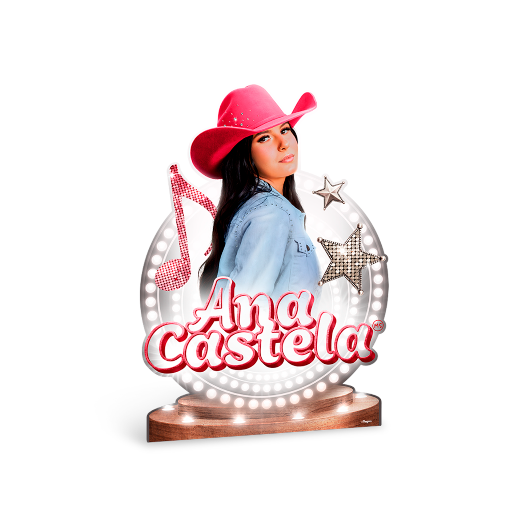 Feito em papel cartonado de alta resistência, o display é projetado para manter-se firme durante todo o evento, garantindo uma decoração impecável e cheia de personalidade. Além disso, sua imagem vibrante e cheia de estilo traz o carisma da Ana Castela, transformando qualquer ambiente e criando uma atmosfera envolvente e autêntica que deixará todos os convidados encantados.