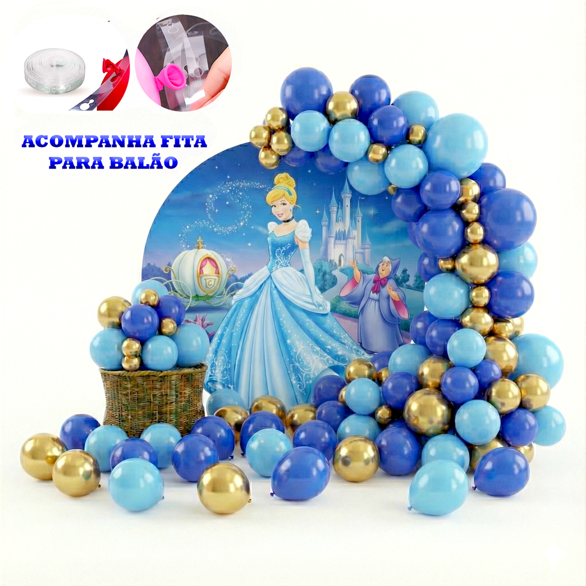 Crie uma decoração encantadora com o Kit 100 Balões Cinderela, trazendo tons delicados e elegantes que remetem ao clássico visual da princesa: azul royal, azul candy e dourado cromado.