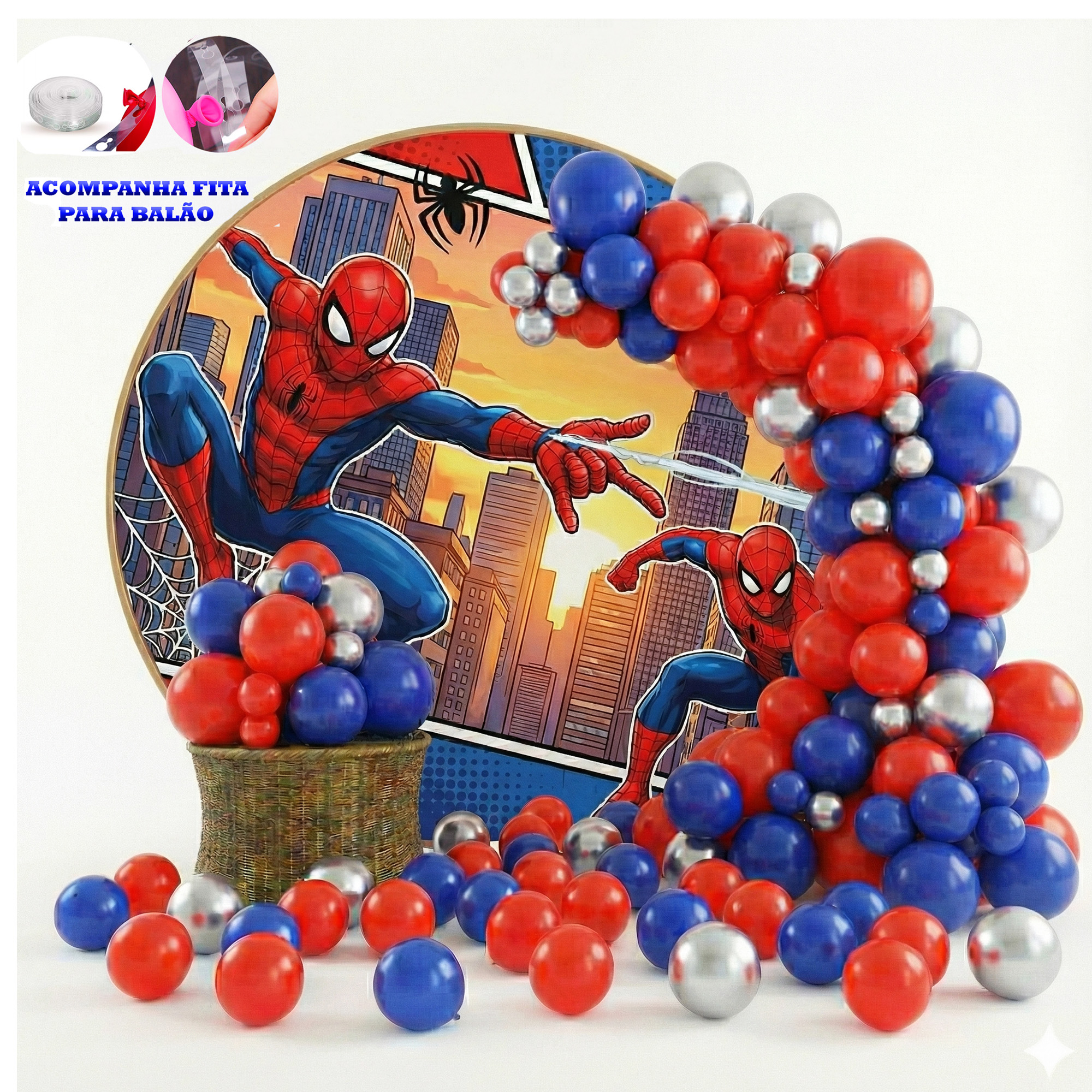 Monte uma festa incrível com o Kit 125 Balões Homem-Aranha, combinando as cores clássicas do herói: azul escuro, vermelho e prata cromado.