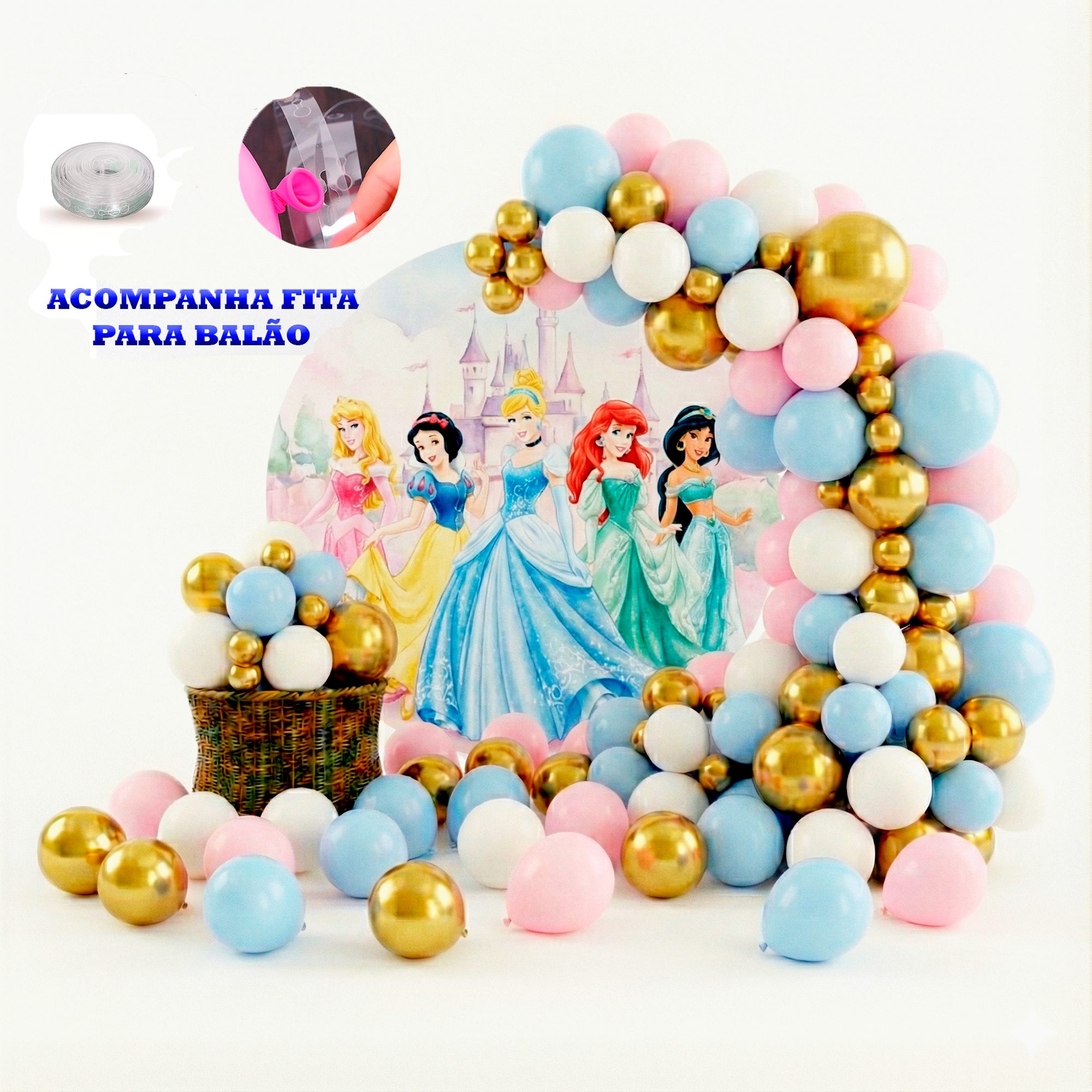 Deixe sua decoração digna de um conto de fadas com o Kit 150 Balões Tema Princesas, combinando tons delicados e encantadores que remetem aos clássicos das princesas: rosa claro, branco, azul candy e dourado.