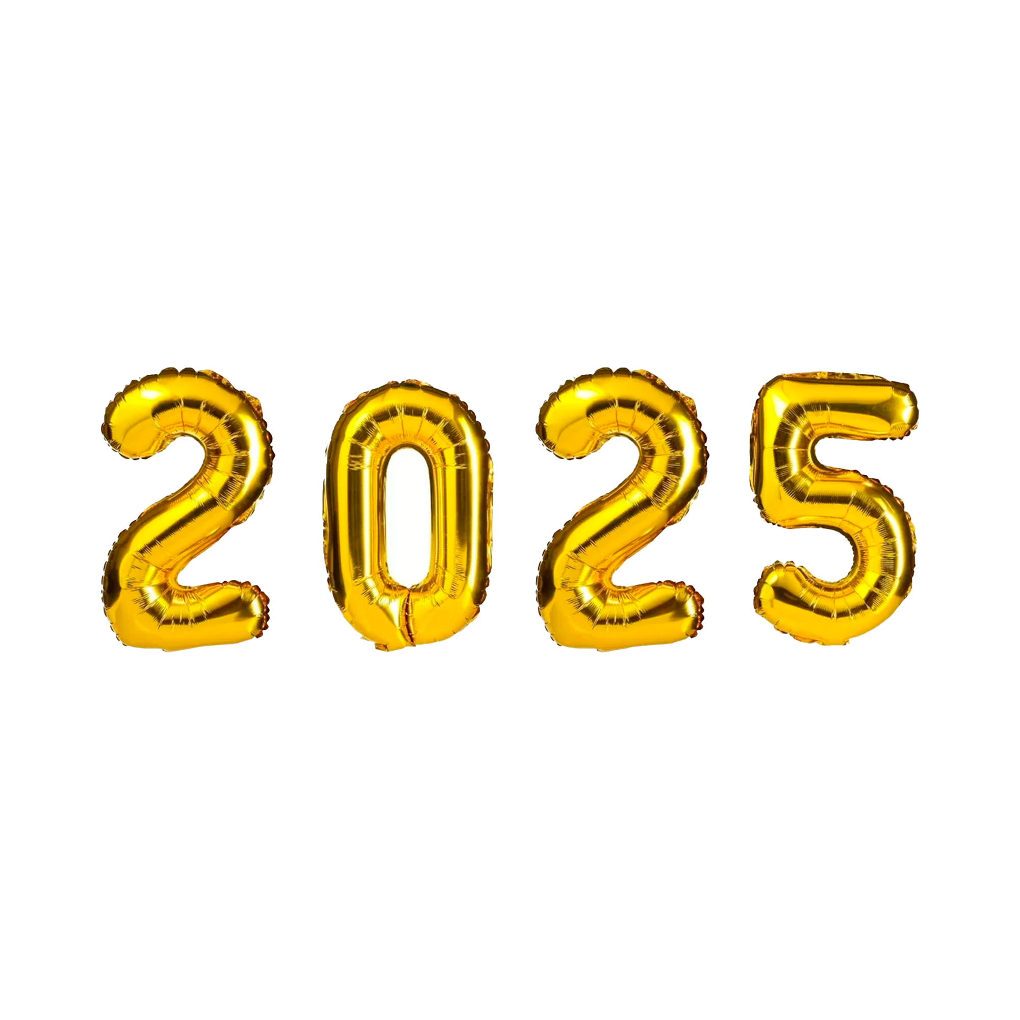 Números metalizados gigantes "2025" (disponíveis em dourado, prateado ou rosé gold).
