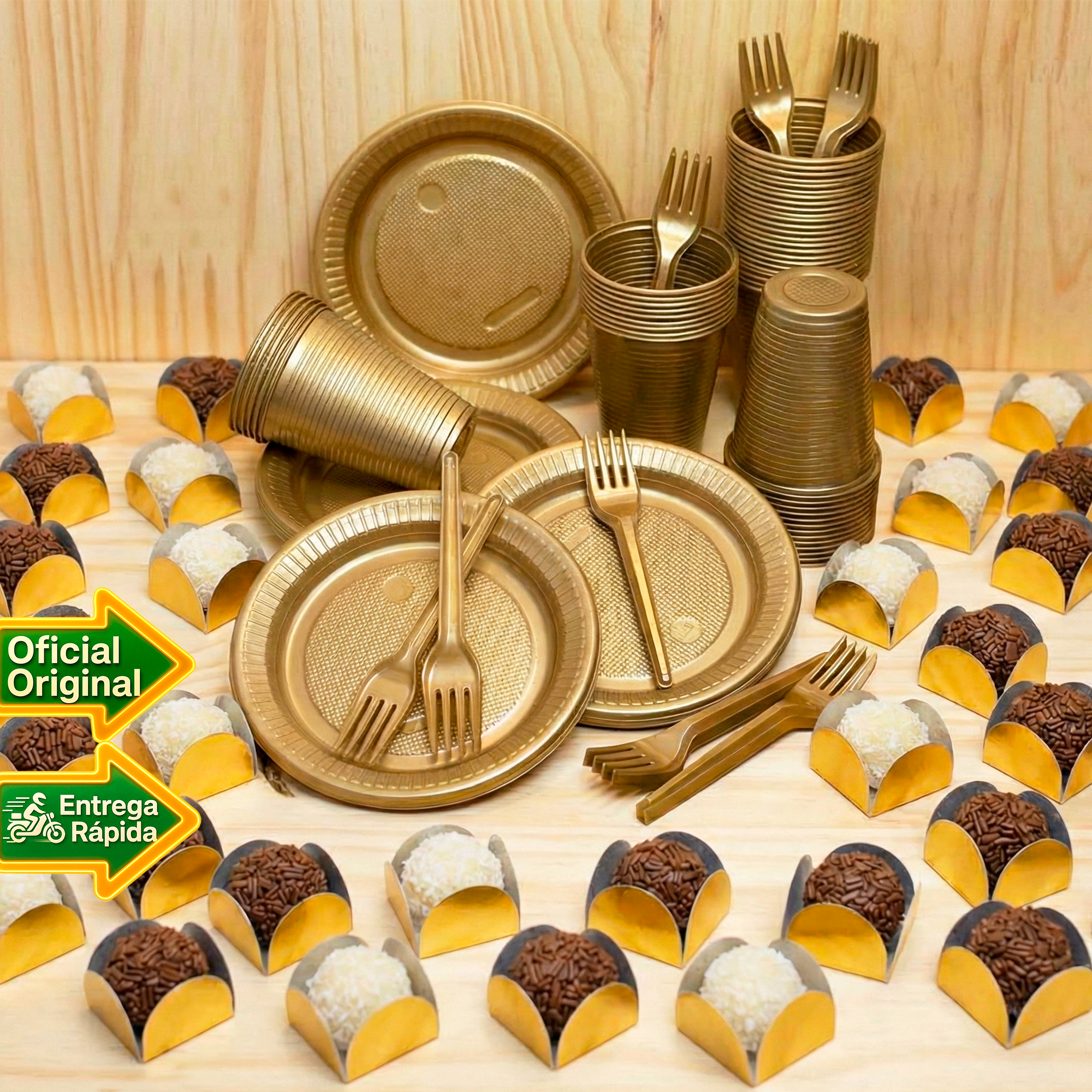 Praticidade e elegância para sua comemoração com o Kit Festa Descartável Econômico Dourado, ideal para aniversários, confraternizações, eventos e comemorações diversas.