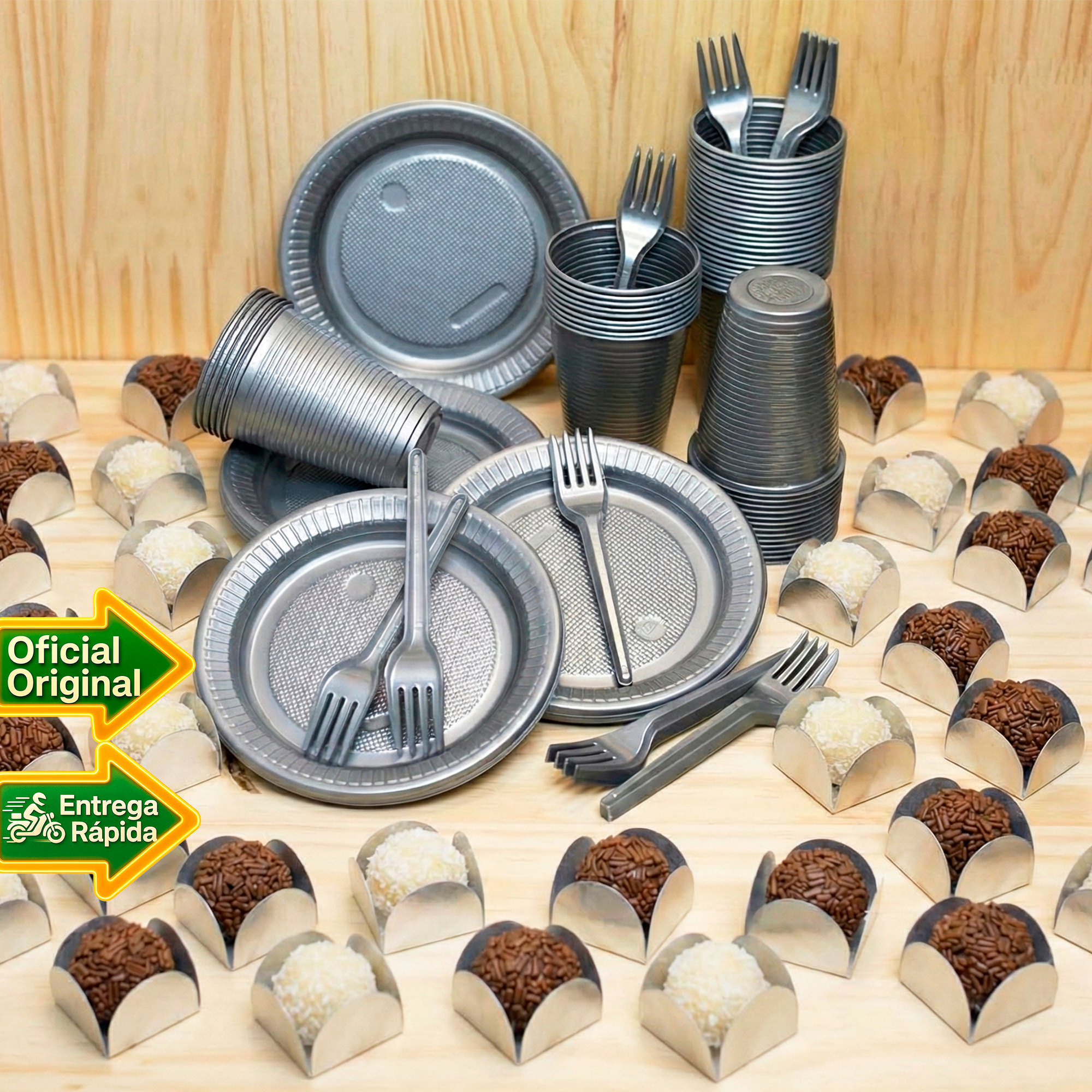 Praticidade e elegância para sua comemoração com o Kit Festa Descartável Econômico Prata, ideal para aniversários, confraternizações, eventos e comemorações diversas.