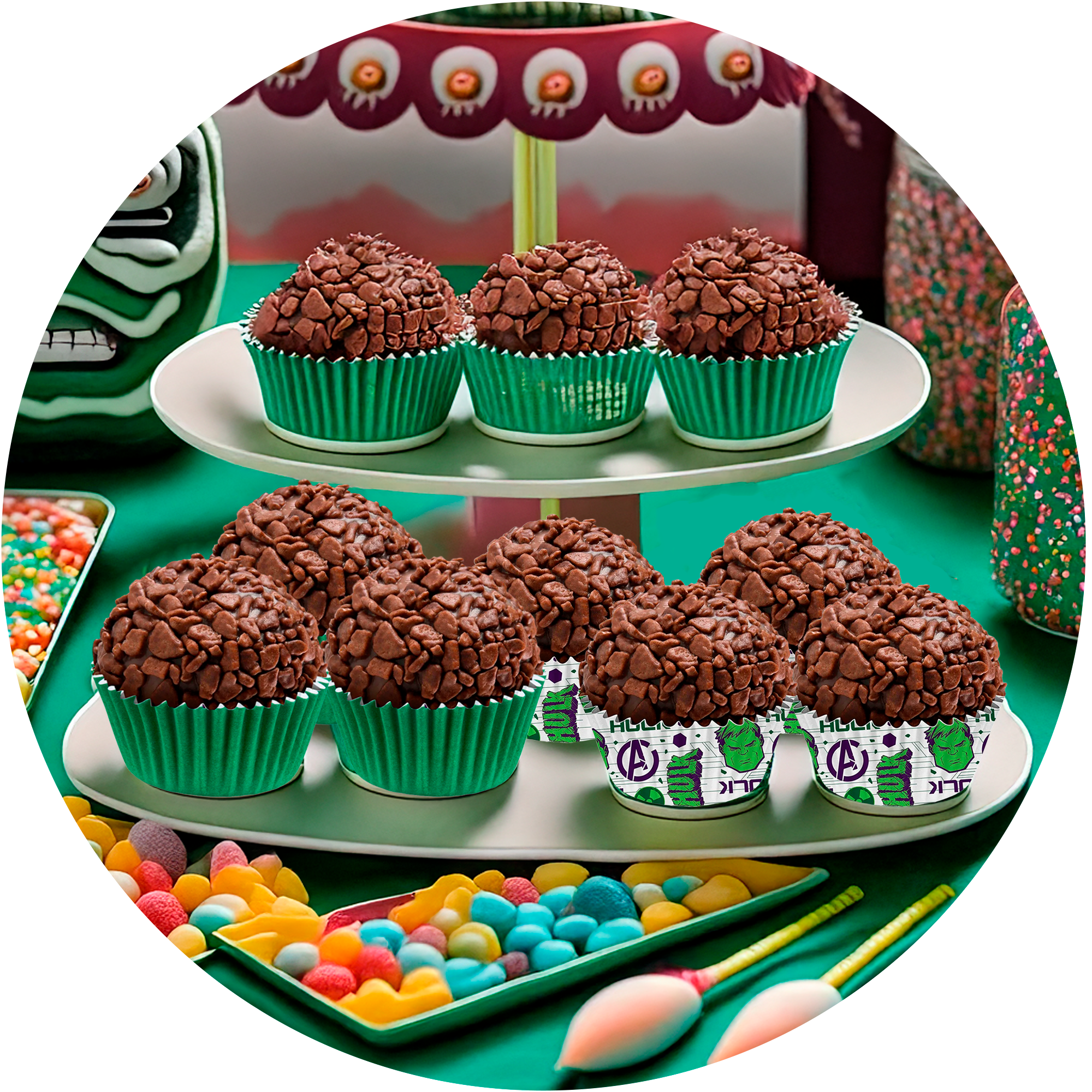 100 forminhas tamanho nº 5 com estampa temática do Hulk: trazem o personagem em destaque para complementar a decoração e encantar os convidados.