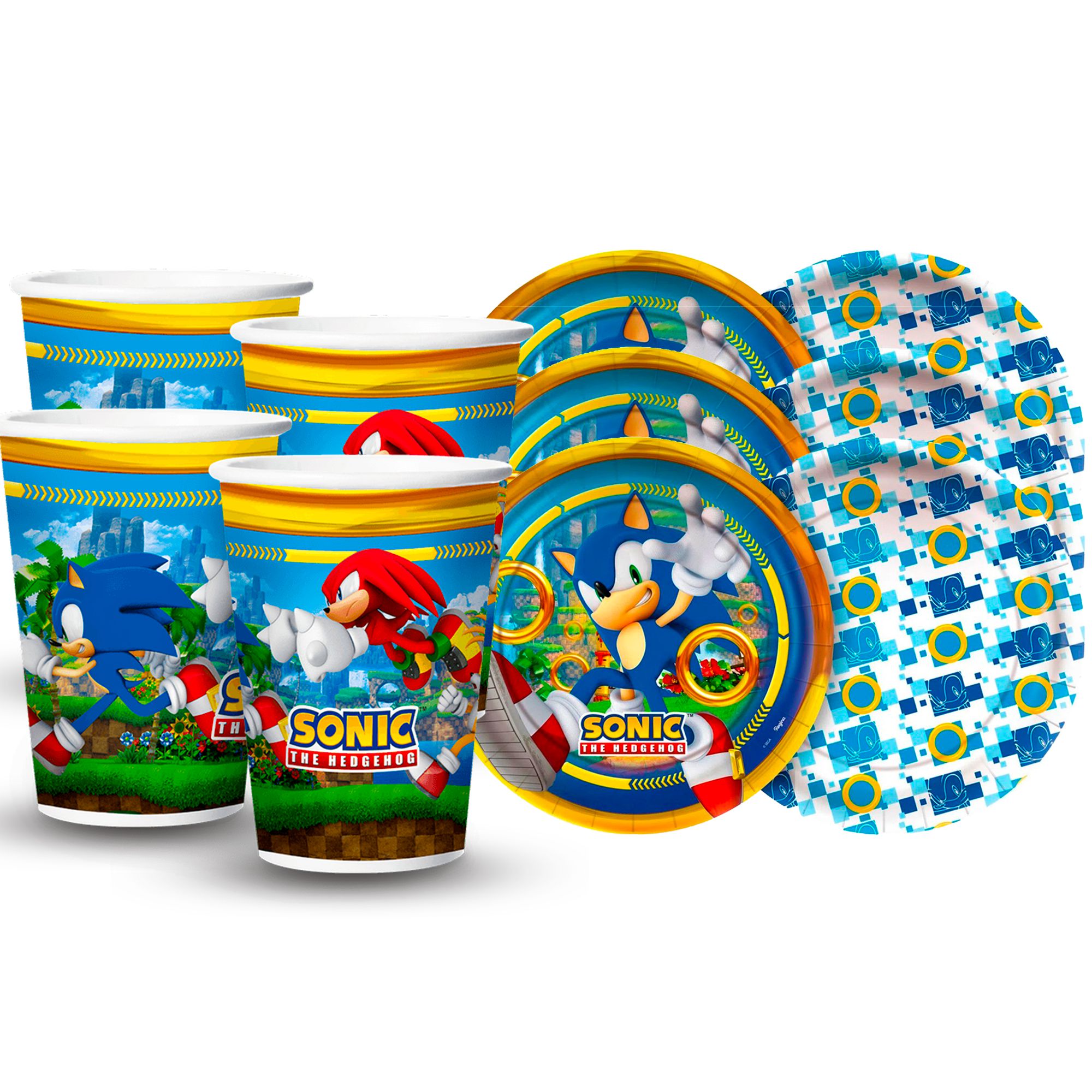 O kit conta com 16 unidades, incluindo 8 pratos vibrantes de 18cm e 8 copos temáticos de 180ml. Os pratos são decorados com imagens dinâmicas e coloridas do Sonic, Tails e Knuckles, enquanto os copos apresentam um design vibrante que certamente irá impressionar os convidados.