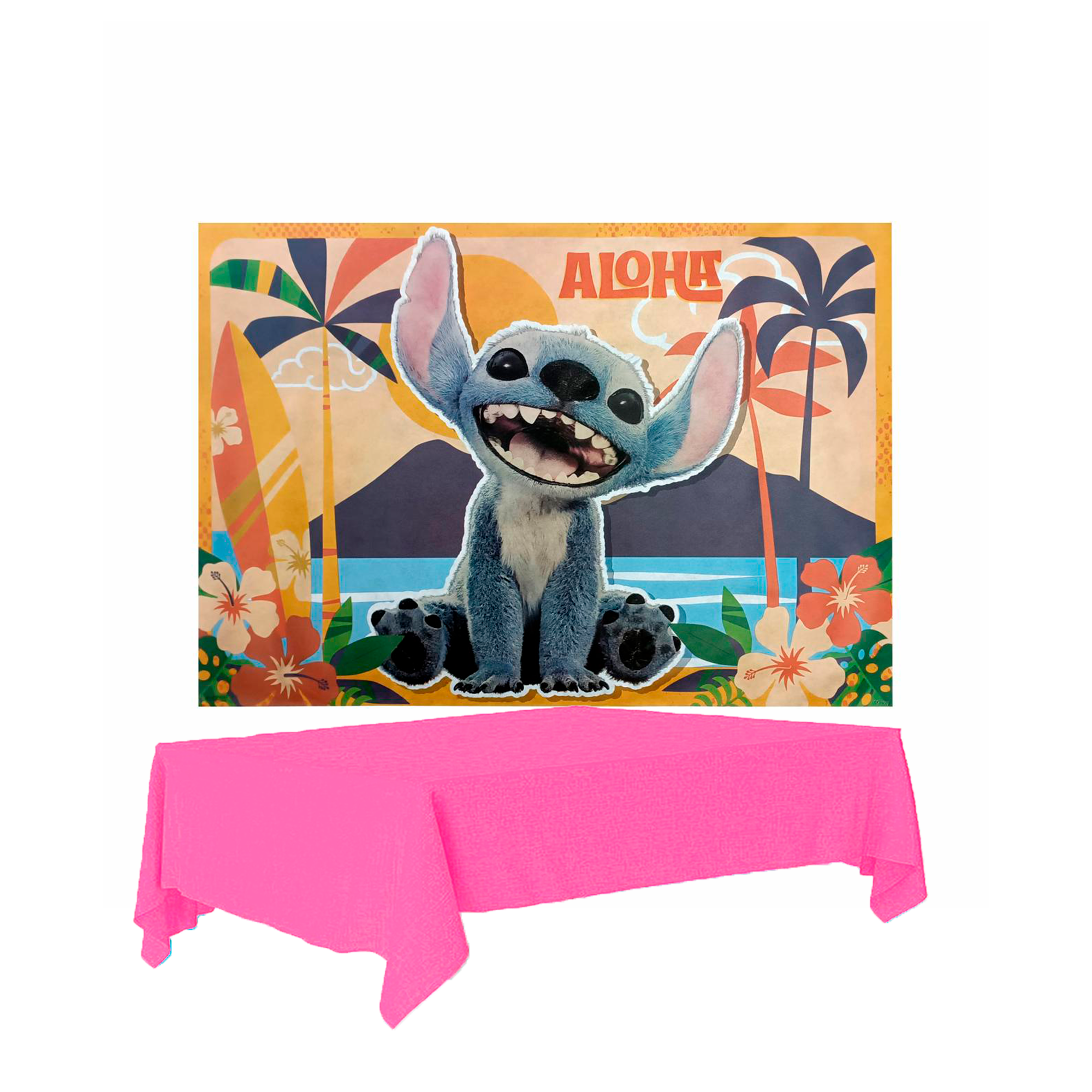 Este kit oferece uma solução prática e econômica para montar uma decoração completa com o tema Stitch. O painel pode ser fixado em paredes, estruturas ou bastidores, enquanto a toalha rosa traz suavidade e combina perfeitamente com o visual do personagem.