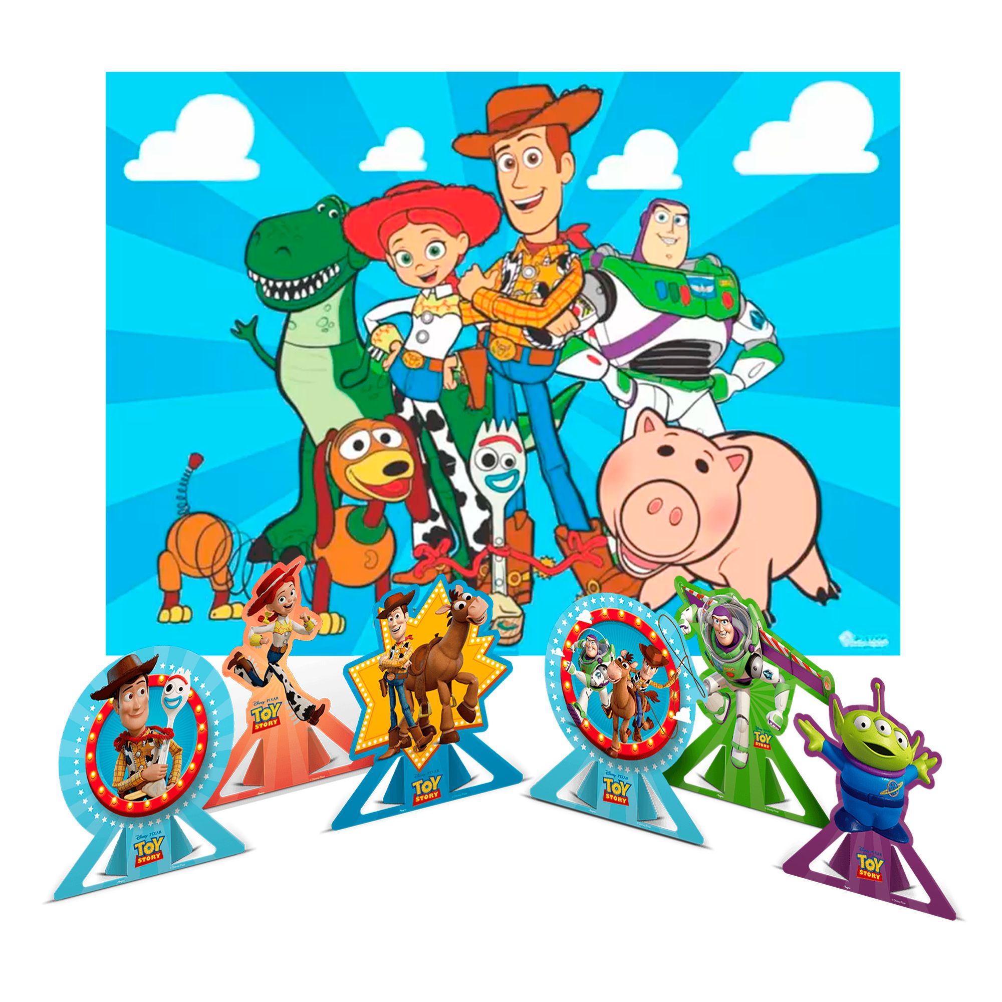 Destacando-se no conjunto, temos um espetacular Painel Temático em TNT, medindo 1,40m de largura por 1m de altura. Este painel cria instantaneamente uma atmosfera cativante, transportando os convidados para o mundo encantado dos adoráveis personagens de Toy Story. Perfeito para fotos e garantindo que a decoração seja inesquecível.