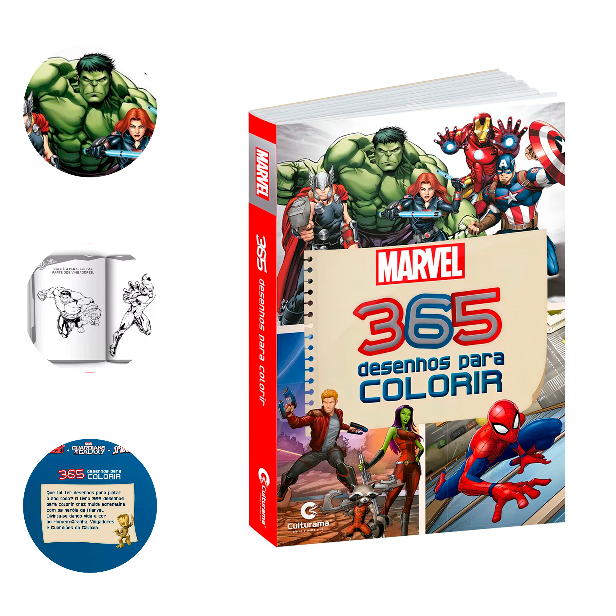 Livro oficial Marvel com 365 ilustrações para colorir, reunindo os maiores heróis do universo Marvel em um só volume. Perfeito para divertir e estimular a criatividade das crianças (e fãs de todas as idades) durante o ano inteiro.