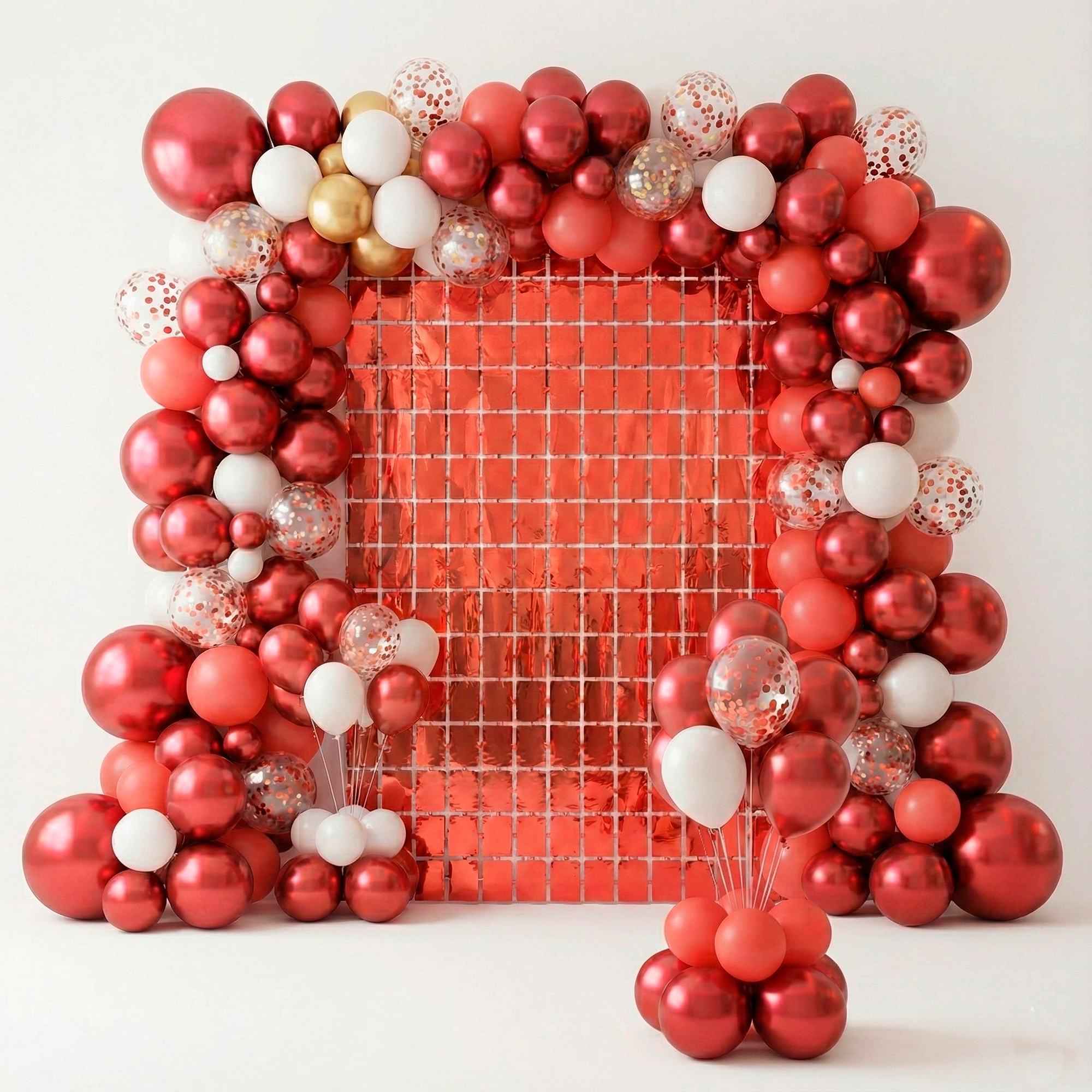 Transforme sua festa com muito brilho usando a Cortina Metalizada Quadrada Vermelha, perfeita para criar painéis chamativos, fundo de mesa principal e cenários incríveis para fotos.