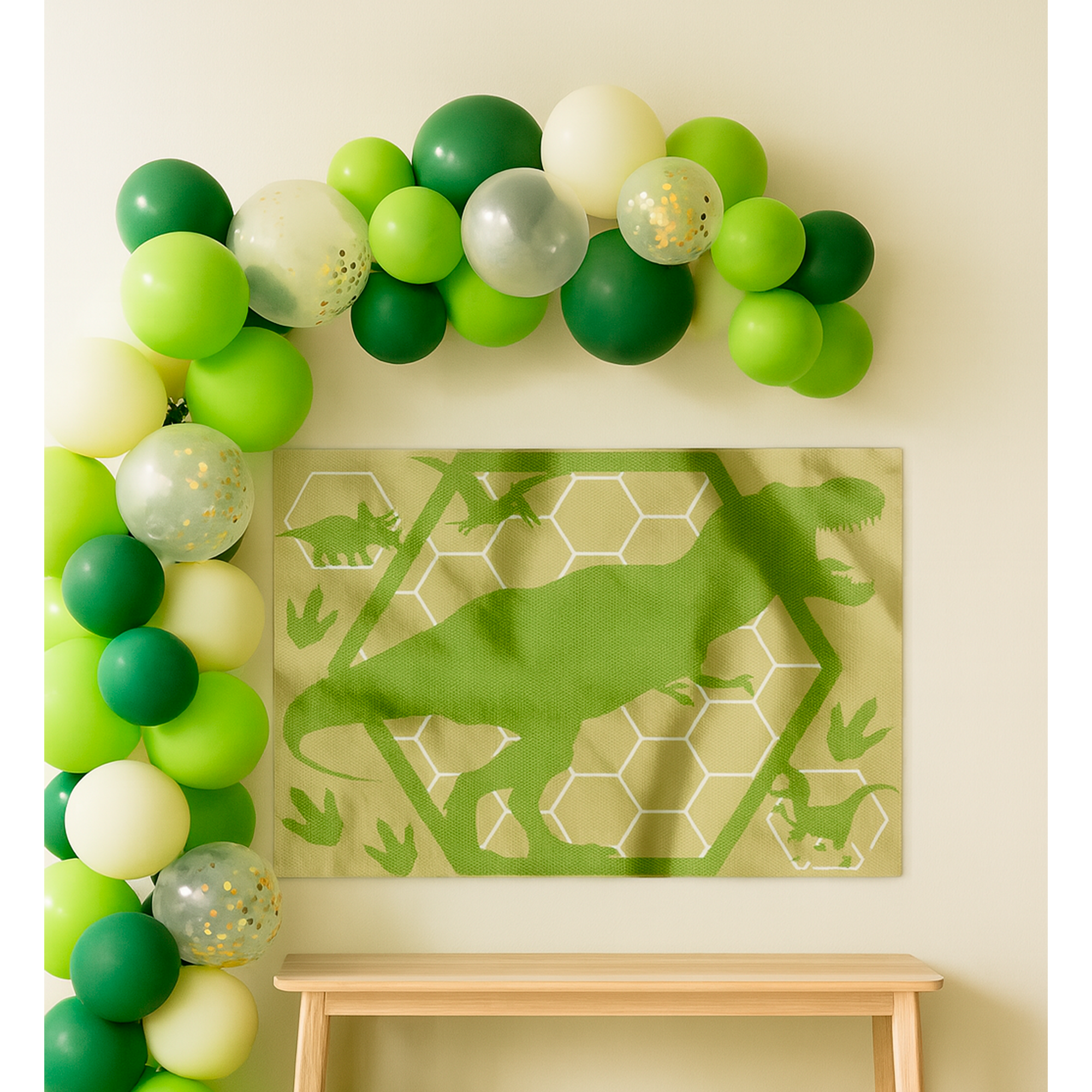 Com dinossauros sorridentes, elementos da natureza e cores vibrantes, o painel cria um cenário animado e envolvente. Pode ser usado como fundo da mesa do bolo, painel de fotos ou decoração de parede. Leve, dobrável e fácil de aplicar, é ideal para quem busca praticidade e impacto visual.