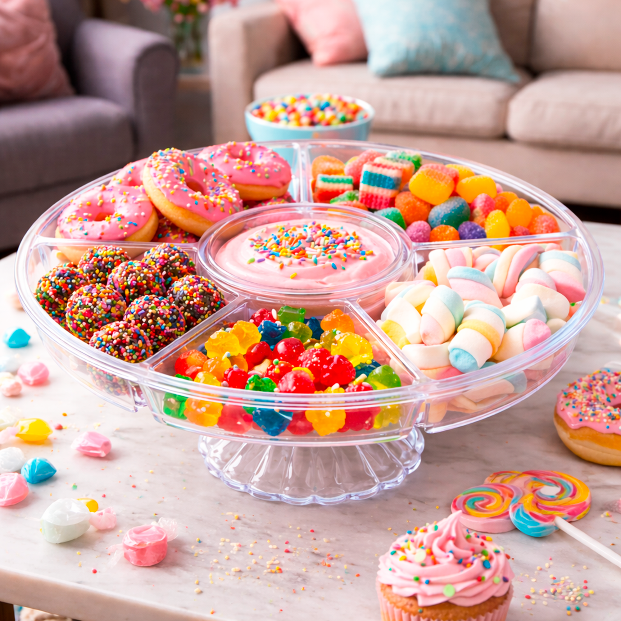 Petisqueira em acrílico luxo, ideal para servir petiscos, fondue, frios, doces, molhos e acompanhamentos com elegância e praticidade. Perfeita para festas, eventos, confraternizações e uso doméstico, valorizando a mesa com um visual moderno e sofisticado.