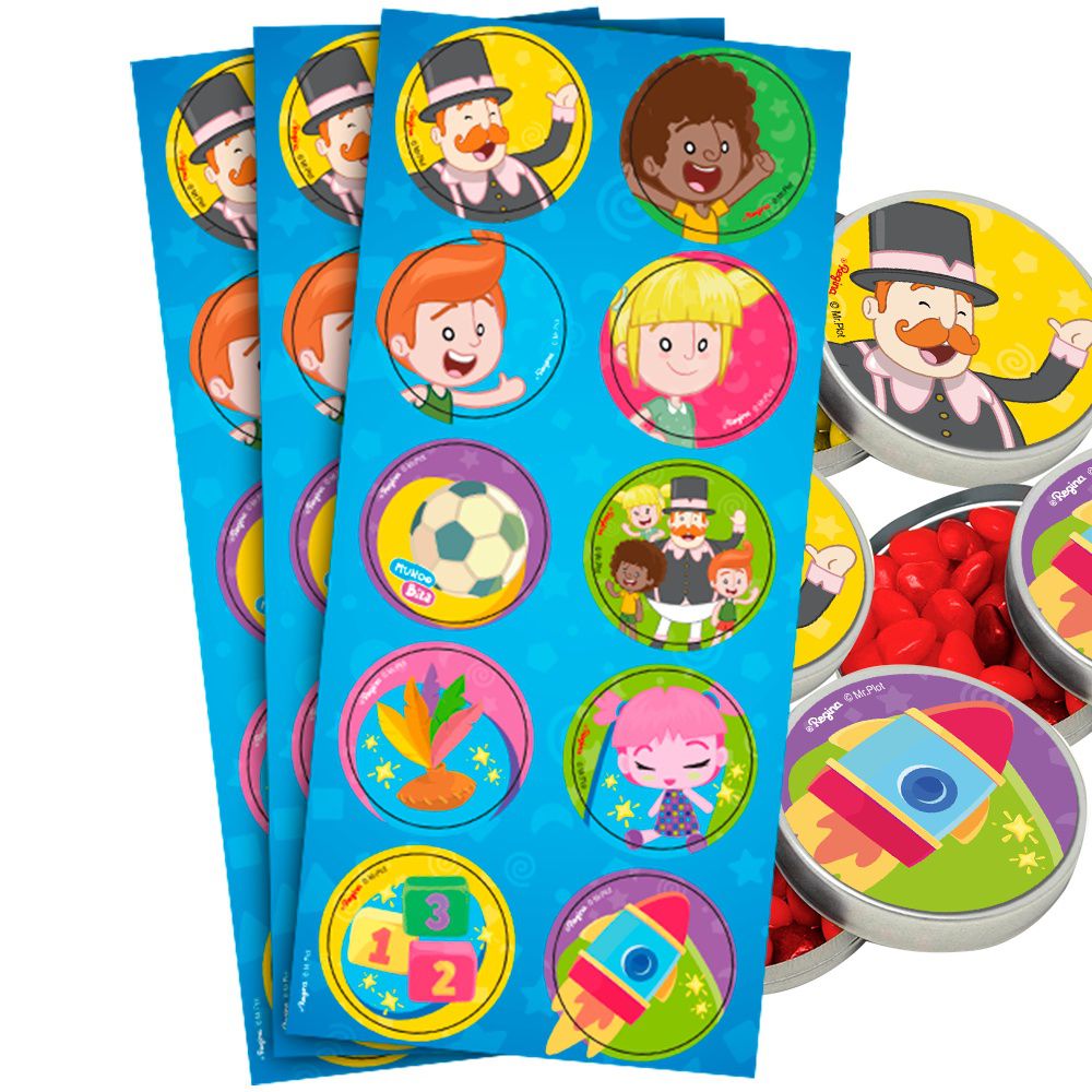 Conjunto de 30 adesivos redondos do Mundo Bita para decoração de festas.