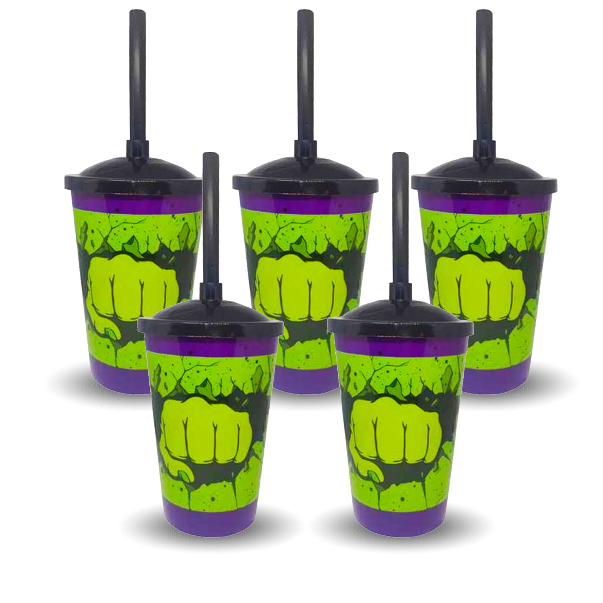 5 Copos Plástico Tampa e Canudo Decoração Vingador Esmaga