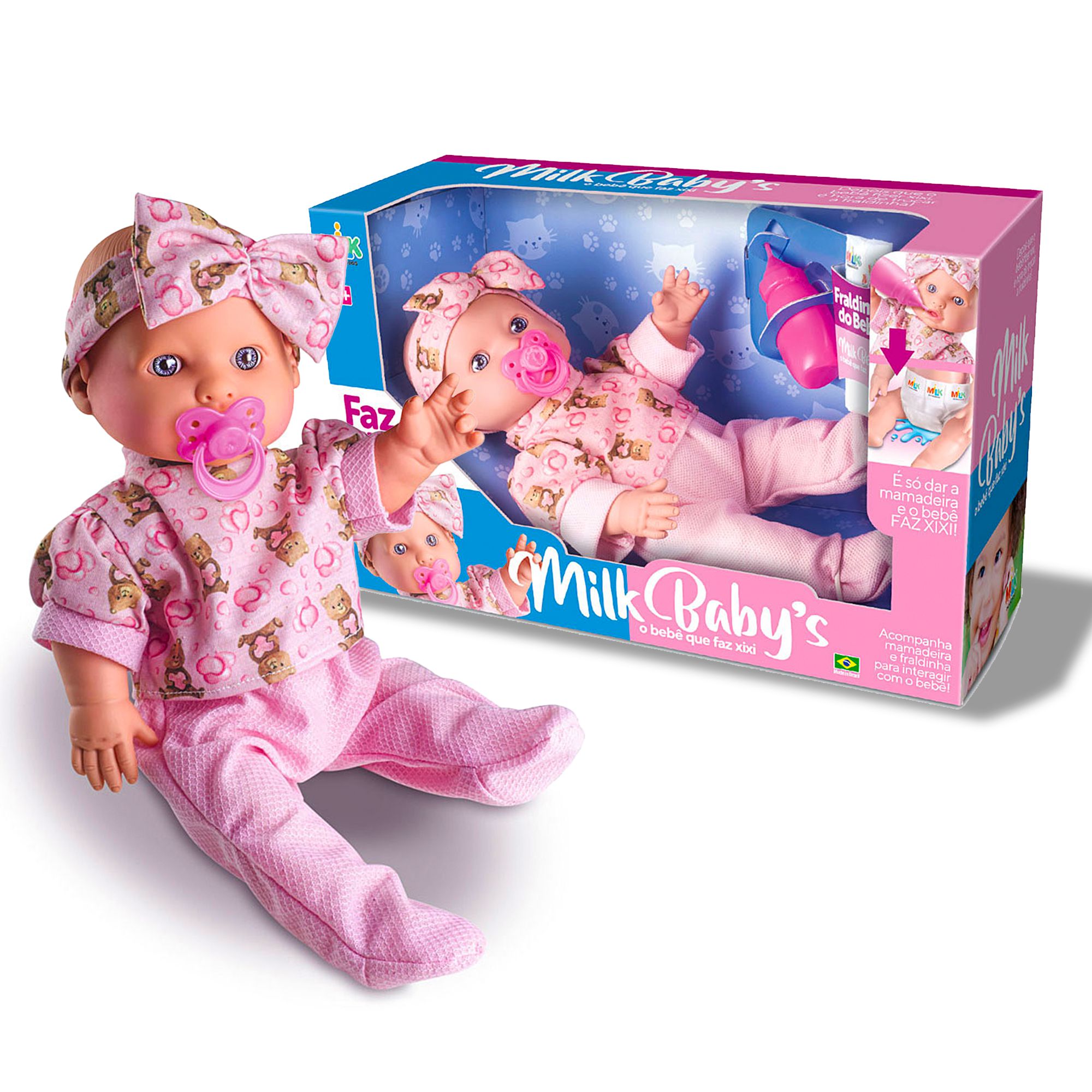 Acessório Incluso: Esta versão especial da Boneca Milk Babys vem com acessórios incrível: uma mamadeira, frauda e chupeta. As crianças podem alimentar sua boneca e vê-la fazer xixi. É uma maneira divertida de ensinar sobre cuidados com o bebê e higiene.