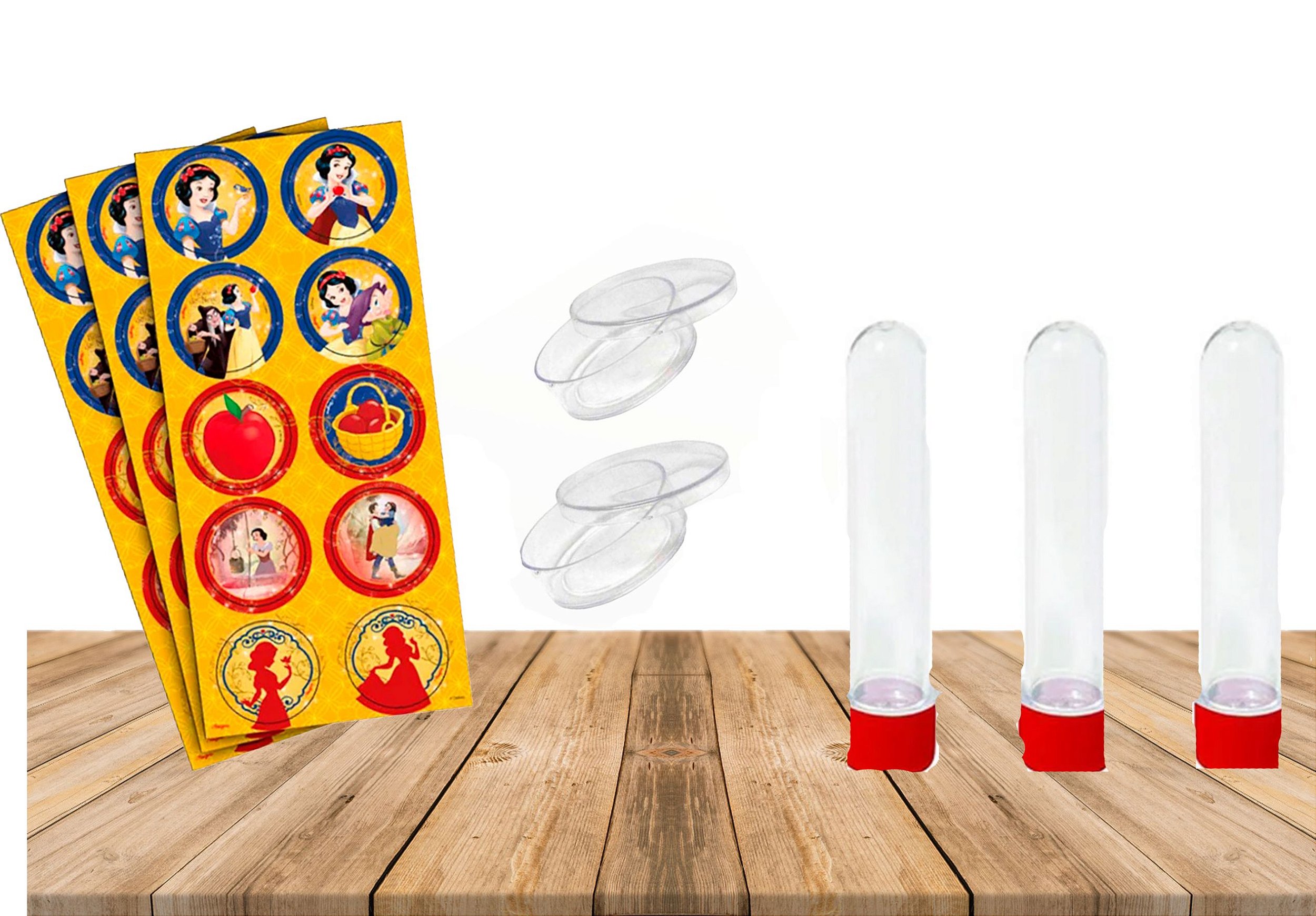 Kit decoração festa Branca de Neve Bita 30 adesivos + 20 Latinhas + 10 Tubetes com tampa vermelha