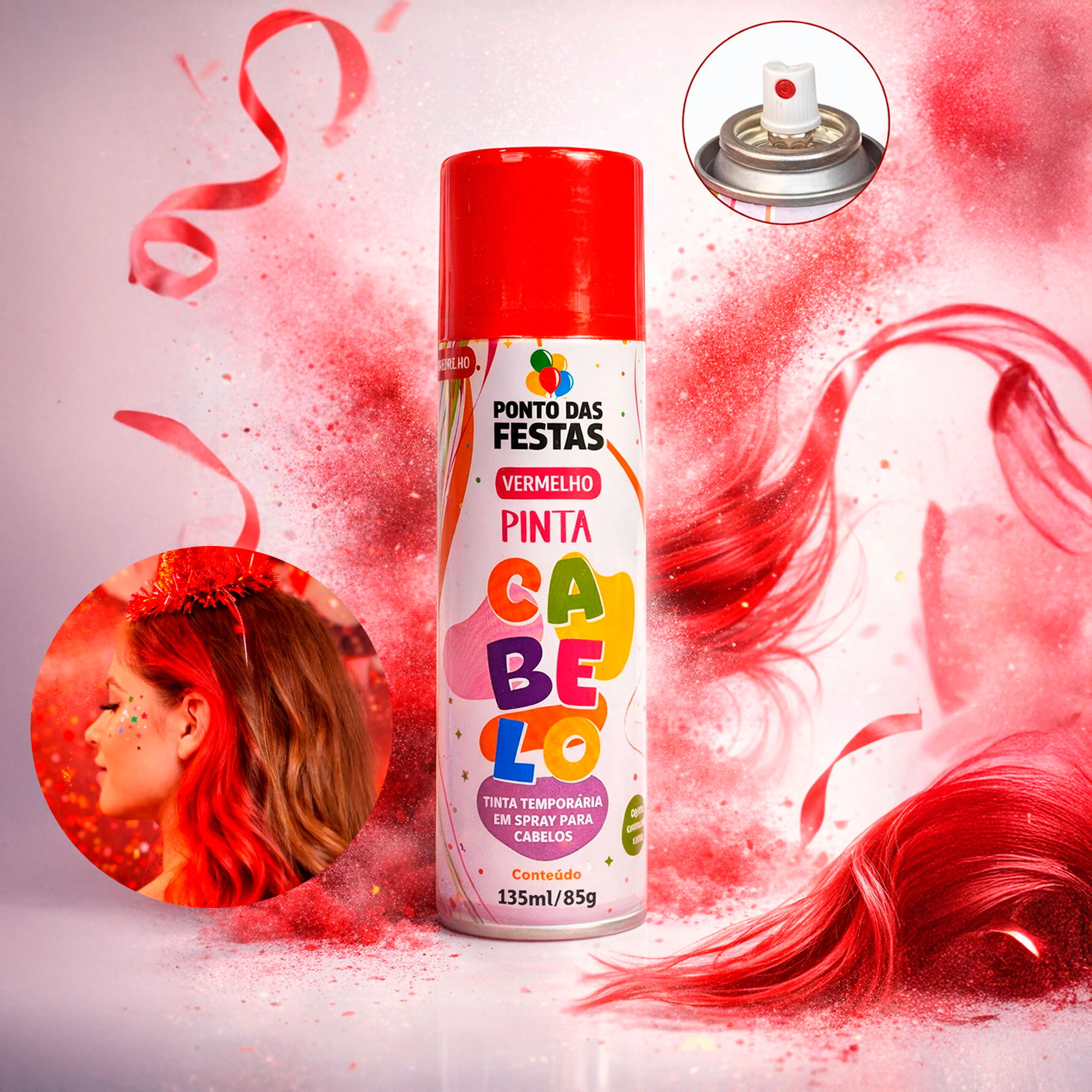 Spray capilar na cor vermelho vibrante, perfeito para dar um toque marcante e cheio de energia ao visual em festas, Carnaval, aniversários temáticos, blocos ou fantasias. Ideal para quem quer um look impactante e divertido.
