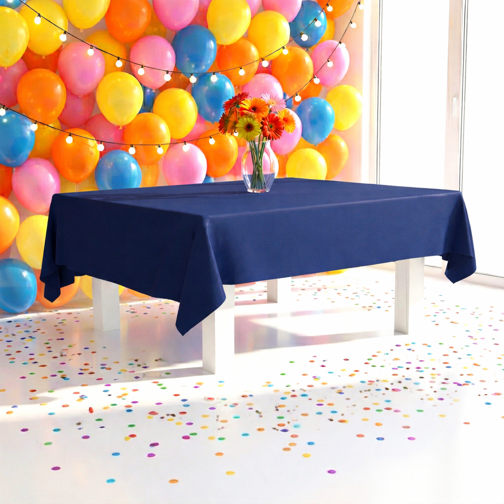 Toalha de mesa em TNT na cor azul marinho, ideal para compor a decoração de festas e eventos com um visual elegante, moderno e sofisticado.